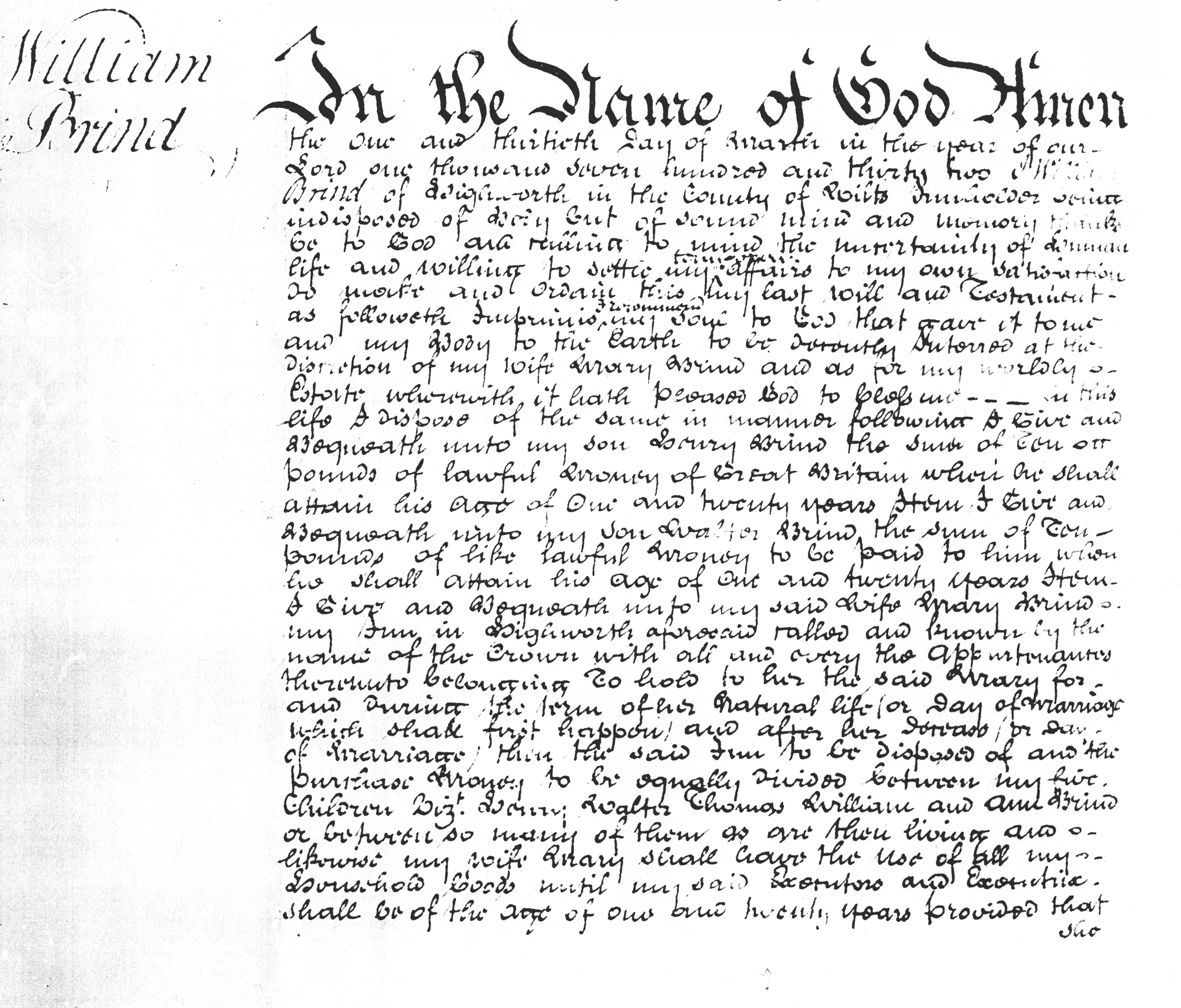 In the name of God Amen. This one and thirtieth day of March in the year of our Lord one thousand seven hundred and thirty two, I William Brind of Highworth in the County of Wilts Innholder being indisposed of Body but of sound mind and memory thanks be to God and calling to mind the uncertainty of Human Life and willing to settle my temporal affairs to my own satisfaction do make and ordain this my last will and testament as followeth the Imprimis I commend my soul to God that gave it to me and my body to the Earth to be devoutly interred at the discretion of my wife Mary Brind {{crossed out, 'Executors and Executrix herein after named}} and as for my worldly estate wherewith it hath pleased God to bless me in this life I dispose of the same in manner following. I give and bequeath unto my son Henry Brind the sum of ten pounds of lawful money of Great Britain when he shall attain his age of one and twenty years. Item I give and bequeath unto my son Walter Brind the sum of ten pounds of like lawful money to be paid to him when he shall attain his age of one and twenty years. Item I give and bequeath unto my said wife Mary Brind my inn in Highworth aforesaid called and known by the name of the Crown with all and every the appurtenances there unto belonging to hold to her the said Mary for and during the term of her natural life (or day of marriage which shall first happen) and after her decease (or day of marriage) then the said inn to be disposed of and the purchase money to be equally divided between my five children, viz Henry, Walter Thomas, William and Ann Brind or between so many of them as are then living and likewise my wife Mary shall have the use of all my household goods until my said executors and executrix shall be of the age of one and twenty years (provided that she do not marry again). And lastly I do nominate constitute and appoint, make and ordain my sons Thomas Brind, William Brind and my daughter Ann Brind joint executors and executrix of this my last will and testament revoking and disannulling and making void all former wills and testaments by me made and done ratifying and confirming this and no other to be my last will and testament and all my goods and chattels and effects in possession and reversion (except what is before bequeathed) shall be to the use and behoof of my said executors and executrix share and share alike and I do devise request and appoint and nominate my brother in law Henry Coleman of Highworth and Thomas Carter of Cricklade St Sampson to be overseers of this my last will and testament and to see the same performed according to the intent hereof and my desire in willing whereof I have here unto set my hand and seal the day and year first above written, William Brind. Signed sealed published pronounced and declared by the above named William Brind to be his last will and testament in the presence of us who subscribed our names in the presence of the testator. D Marsh, John Probetts, James Potts. On the Wiltshire version it says:-- At Highworth 6th May 1732, Maria Brind, sworn before Ja:Ayscough surr. On the version in the PRO, which is the real will, there is the note on the right at the bottom:-- Thomas Brind the son of the deceased and the surviving executor within named was duly sworn as usual (and that the effects do not amount of £300) before me. (signature) F Simpson, surrogate. |