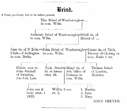 The Visitation of Wiltshire (our reference C.2294) of 1623 shows the pedigree of Brind of Wanborough-- as do the pruinted versions (a) edicted by George W Marshall in 1882 and (b) of the Harleian Society Vol 105/6. Our volume shews no arms and has no comment; Marhsall's says "A coate produced to be better proved" while HS 105/6 gives a blazeon and the same annotation as Marhsall.