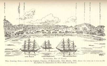Kororareka, Bay of Islands This drawing, from a sketch by Captain Clayton, of Kororareka, 10th March, 1845, shows the town as it was on the day before its destruction by Hone Heke and Kawiti. from the Aleutians to Foveaux Strait and from the Japan coast to the Kermadecs. Hard old tyrants some of these whaling skippers, from Nantucket, or New Bedford, or Martha's Vineyard, or Boston, Mass.; of all sailors they are the monarchs absolute; their cruises last for years, and their crews they hold by the strong hand, and good rewards to the natives for the capture of deserters. Raffish-looking crews they captain. No two men wear clothes alike; some have blue monkey-jackets and duck trousers, some are in the dungarees of shipboard work; their headgear is a study in the variety of forecastle-made caps of canvas, Scotch caps, tarpaulins, and shapeless hats of patched cloth. Lean, hard-worked hunters of the world's biggest game; harpooners, and oarsmen, and blubber-flenchers from all the seafaring countries of the world: long-limbed, drawling men of the New England States; coal-black darkies from Jamaica; half-breed Indians from the State of Maine; piratical ear-ringed Portuguese-negroid nondescripts from the Azores and Cape de Verde Islands; brisk Irish lads unmistakable; and here and there a sturdy man of Kent or Devon who has run perhaps from a British man-of-war with a flogging captain and found worse than the "cat" in the oil-soaked whaler. Follow the stores-buying captain or chief officer of the "Levi Starbuck" into one of the weatherboard trading-houses, blue with strong tobacco smoke and thick with the tang of tarred rope. This interior is a typical South Sea warehouse; the proprietor is ship-chandler, sea-stock dealer, ironmonger and gunsmith, grog-seller, gunpowder-purveyor, and a dozen other trades. He can provide a ship with anchor and cable, or set the Maoris on the track of Captain Ephraim J. Nye's runaway boat-steerer with admirable despatch; provide a 300-ton barque with a complete new set of sails or sufficient muskets and ammunition to conquer a cannibal island. There are blankets, prints, red sealing-wax, tomahawks, bullet-moulds, iron pots, tobacco by the cask, for the Maori trade; sugar and molasses and rum from the West Indies; salt beef and pork and adamant biscuit for sea-fare; sou'-westers, cutting-in spades, harpoon-line by the hundred fathom, lance-heads, charts, binnacle lanterns, spy-glasses, and boat-compasses; pistols and knuckle-dusters for the afterguard, holystones and squeejees and coal-tar to keep the fists of the 'foremast hands out of mischief. Now board one of those whaleships lying out yonder at an easy anchor-the ships that made this Bay of Islands famous-and you shall see the most conservative of all craft afloat. While every other phase of sea-life and every other kind of ship has changed out of all likeness to the olden type, the sailing whaler does not alter. Step into the stern-sheets of one of those beautifully modelled carvel-built whaleboats with the tobacco-chewing New England mate standing at the 22-foot steer-oar. See how the crew of five stretch back to it with their ash oars-the long, full stroke of the true whaleman, who will have none of your quick and jerky Navy oarsmanship. A few of those long strokes and we are clambering up a rope ladder on to the white-scrubbed decks of a ship as clean as a yacht for all her greasy trade. The pervading but not unpleasant smell of oil, the stuff that permeates her every timber and fills half the casks in her hold; the rows of sharp-ended 30-foot boats at her cranes and davits; the leather- or canvas-covered harpoons and lances whose long shafts project from each boat; the barrel slung as a crow's-nest at her maintopgallant-masthead-these all proclaim her calling. But there is something more about her that tokens her a ship apart from all others, this barque "Narwhal," or "Levi Starbuck," "Canton Packet," "Pocahontas," or "Charles W. Morgan," or however she may be named. The bluff-bowed square-sterned craft, with her sides all hung with boats painted light blue like the sea, has an indescribable air of having been out of the world for years and years. The whale-hunter under canvas seems almost part of the sea, so long are the absences from port, so habituated the crews to the ways of the great deep. In such a craft as this Herman Melville sails sperm-whale chasing at the time of our narrative; it is from just such a barque as the "Charles W. Morgan" or the "Awashonks" that he deserts to find the beautiful valley of Taipi and to give the world an undying true romance of the South Seas. The "Little Jule" of his Marquesan and Tahitian adventures, or the ivory-garnished "Pequod" of "Moby Dick, may "veritably be one of these far-roving barques that ride at the quiet anchorages of Kororareka and Wahapu this year 1845. If you are privileged to explore the wrinkled canvas-backed charts to look into the captain's log-book you will see curious symbols that belong to the whale-fishing trade alone. The pencilled zigzag lines of the vessel's cruising course across the Pacific are punctuated every here and there with rough drawings of a whale's flukes, or the head of a great sperm bull, or maybe a school of porpoises. Each pictograph tells a tale of oil-getting, or of "drawn irons" and a lost whale; perhaps now and again a boat lost. Each emblem of a "kill" is figured with the numbers of barrels obtained. "Dirty work for clean money": sperm-oil these years of 1840-50 rises steadily until it is worth a dollar a gallon, and bone from the "right" whale is quoted at £200 per ton in New York. Observe that all these merchant ships are armed, some with a single iron carronade or a brass gun on each side, some with whole broadsides of four or six guns, 9-pounders and 12-pounders. Yonder taut-masted brig, a trader from Hobart Town, has a swivel gun on her poop as well as a whole battery on her main deck; she is lately in from a 