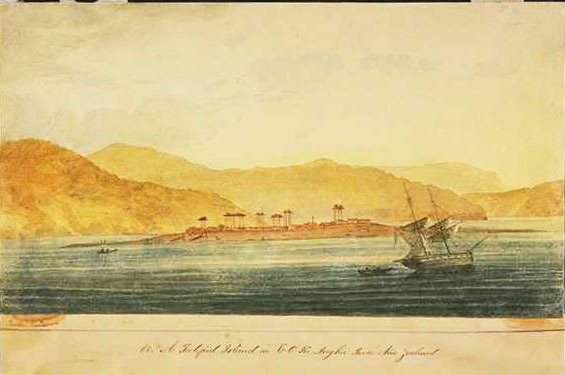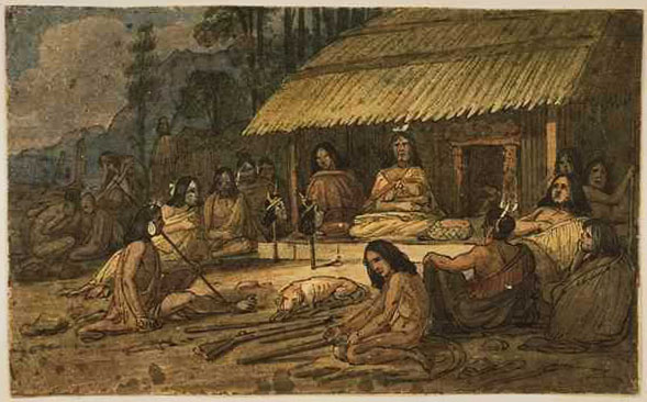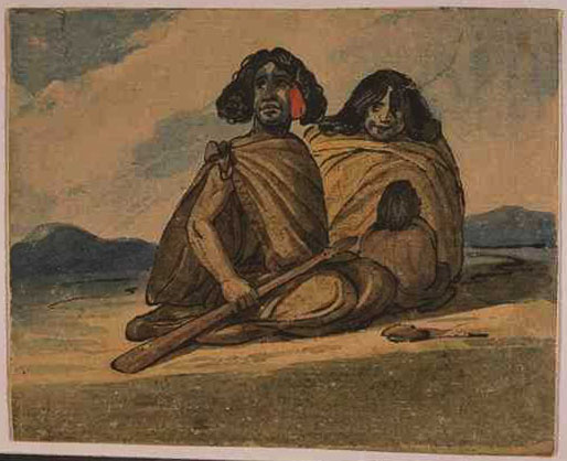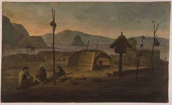 New Zealand The works included here are important as a record of traditional Maori art and culture, long since lost, and also provide information about the early European settlements in the Hokianga and the Bay of Islands area. Earle left Sydney on 20 October 1827 en route to New Zealand where he had `hopes of finding something new for my pencil in their peculiar and picturesque style of life'. Although not the first artist to visit there, he was certainly the first to take up residence. He travelled overland from Hokianga Harbour to the Bay of Islands and back again during the next six months and developed a great respect for the Maoris with whom he came in contact. He was also well placed to observe the impact made on their culture by European whalers, traders and missionaries. After many adventures, he reluctantly boarded the Governor Macquarie on 14 April 1828 when she was ready to sail with `her cargo of kauri planks, flax and potatoes' and returned to Sydney. |