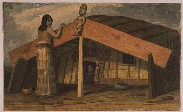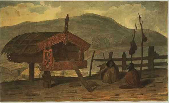 | A tabood store house, Bay of Islands (1827) 20.3 x 34.3 NK12/69 T107 |