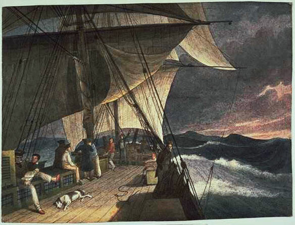 He also produced at least six watercolours depicting aspects of shipboard life, several of which were later worked up into oil paintings and exhibited at the Royal Academy in London. They include Divine service on board a British frigate (cat. 1), Midshipmens quarters on board a ship of war (cat. 2) and Scudding before a heavy gale off the Cape, lat. 44° (cat. 4). Prior to this time, few artists considered such routine occurrences were worthy of their attention and it was not until the second half of the nineteenth century that genre-type scenes on board ships--particularly prints--gained popularity. |