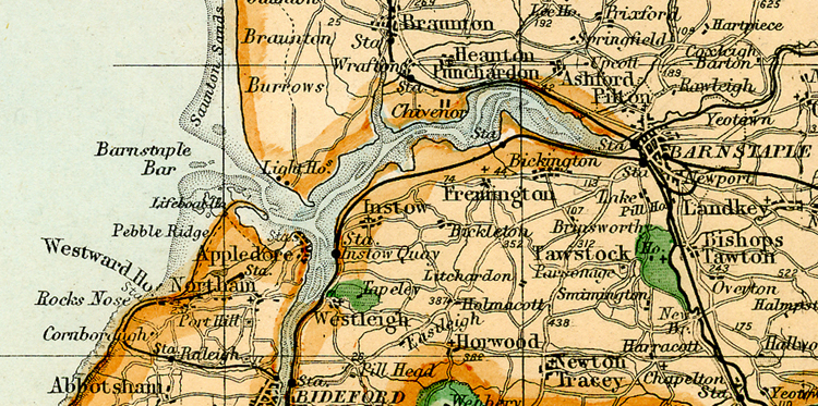 The map above is from Bacon's Popular Atlas of the British Isles of 1909. Fremington is seen centre above (to the north of) Bickleton and to the east of Instow. It is described as three miles to the west of Barnstaple, the nearest big town. The nearest classified road is the B3233.. |