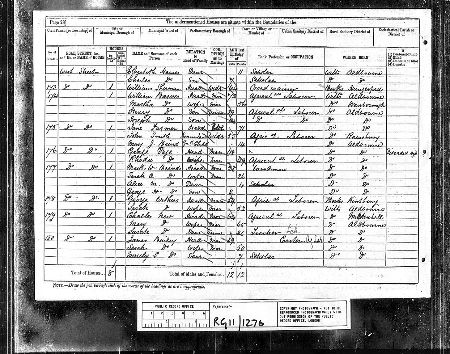 | Mark W Brind | Head | 28 | woodman | Aldbourne, Wilts | Sarah A Brind | wife | 26 | Aldbourne, Wilts | Alice M | Daur | 4 | Scholar | Aldbourne, Wilts | George H | son | 2 | Aldbourne, Wilts |