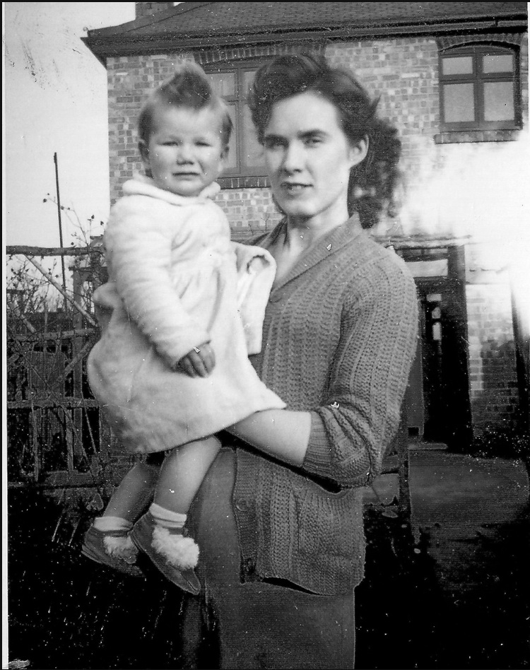 Barbara Brind holding Christopher Lee, in the garden of the house in Cranmer Road, Cowley. About 1956.