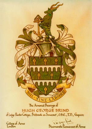Arms: Vert two bars embattled on the lower edge the crenelles enarched argent between six spearheads gold; Crest: Upon a helm with a wreath argent and vert a demi greater kudu couped vert armed and supporting between the forelegs an anchor gold. In the Shield of Arms the *Norman origin is reflected in the arches; the centuries resident in Wiltshire (my grandfather Charles leaving Highworth for the Isle of Wight in year 1855) in the alternate bars of green and white from the County Arms and allusion to the first Brind Armorial Bearings last known to be used by Frederick William Brind, The Court Lodge, Chelsford, Kent, by incorporating six golden spearheads in addition to the Motto. In the Crest, link with the Isle of Wight where my father and self were born, is in the anchor which appears in both the Island's Arms and Crest and my 50 years plus service in Africa in the demi greater Kudu, below which is a Crest wreath, such wreaths dating back to the 14th century when the use of Crests commenced, buckled on to the top of a helm; in order to hide the untidiness of such strapping or buckling, two strands of twisted silk were placed around the crown of the helm. The tinctures in the Crest reflect those of the Arms in the interest of unity of design. *BRIND- on the brow of a hill. |