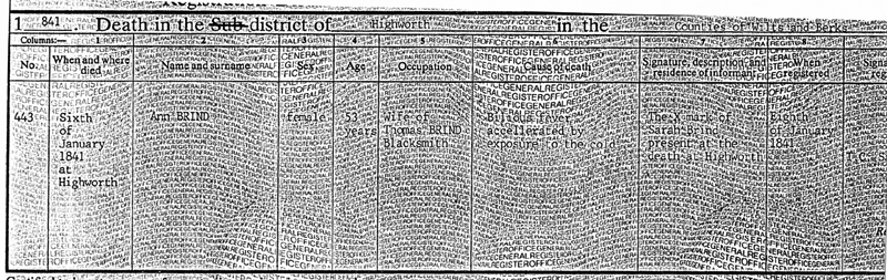 | 443 | Sixth of January 1841 at Highworth | Ann Brind | female | 53 years |