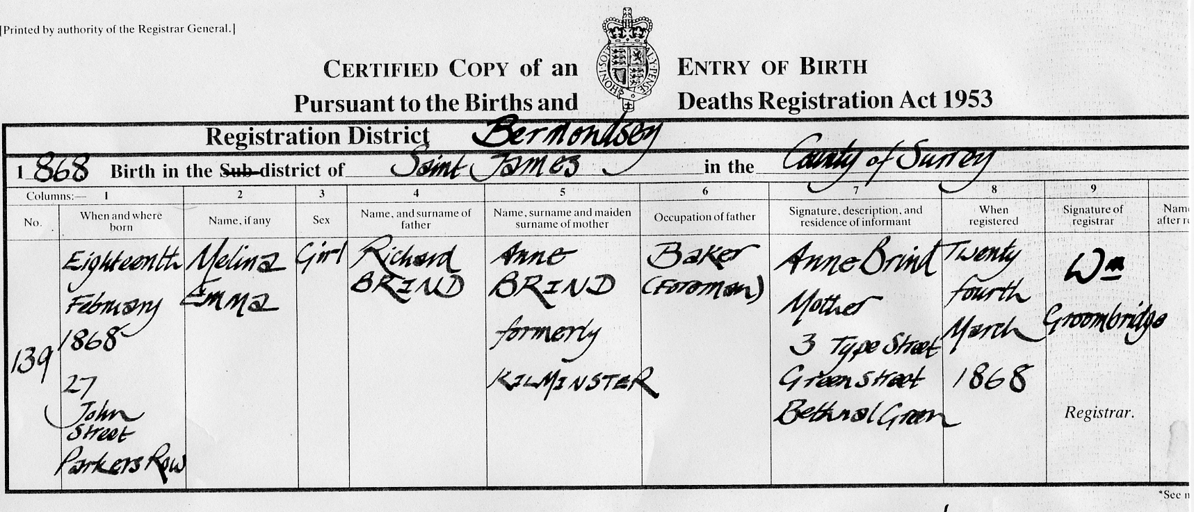 Baker (foreman) | Anne Brind Mother 3 Type Street, Green Street, Bethnal Green |