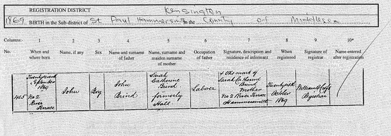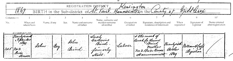 | Registration district of Kensington 1869 BIRTH in the sub-district of St Paul Hammersmith in the County of Middlesex |