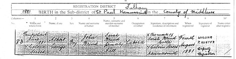 | Registration district of Fulham 1881 BIRTH in the sub-district of St Paul Hammersmith in the County of Middlesex |