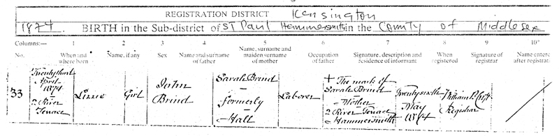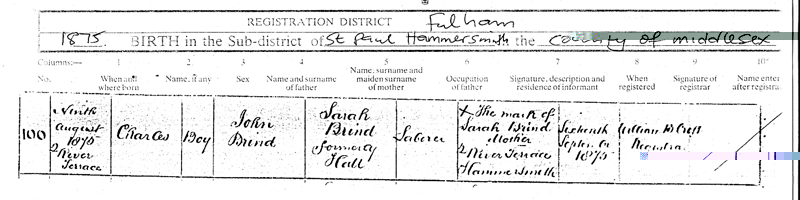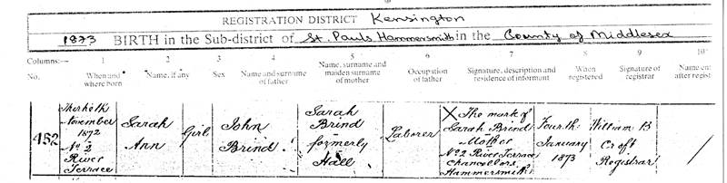 Labourer | x the mark of Sarah Catherine Brind Mother No 2 River Terrace Hammersmith |