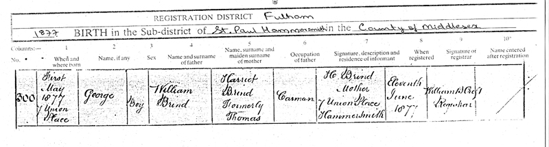 | Registration district of Fulham 1877 BIRTH in the sub-district of St Paul Hammersmith in the County of Middlesex |