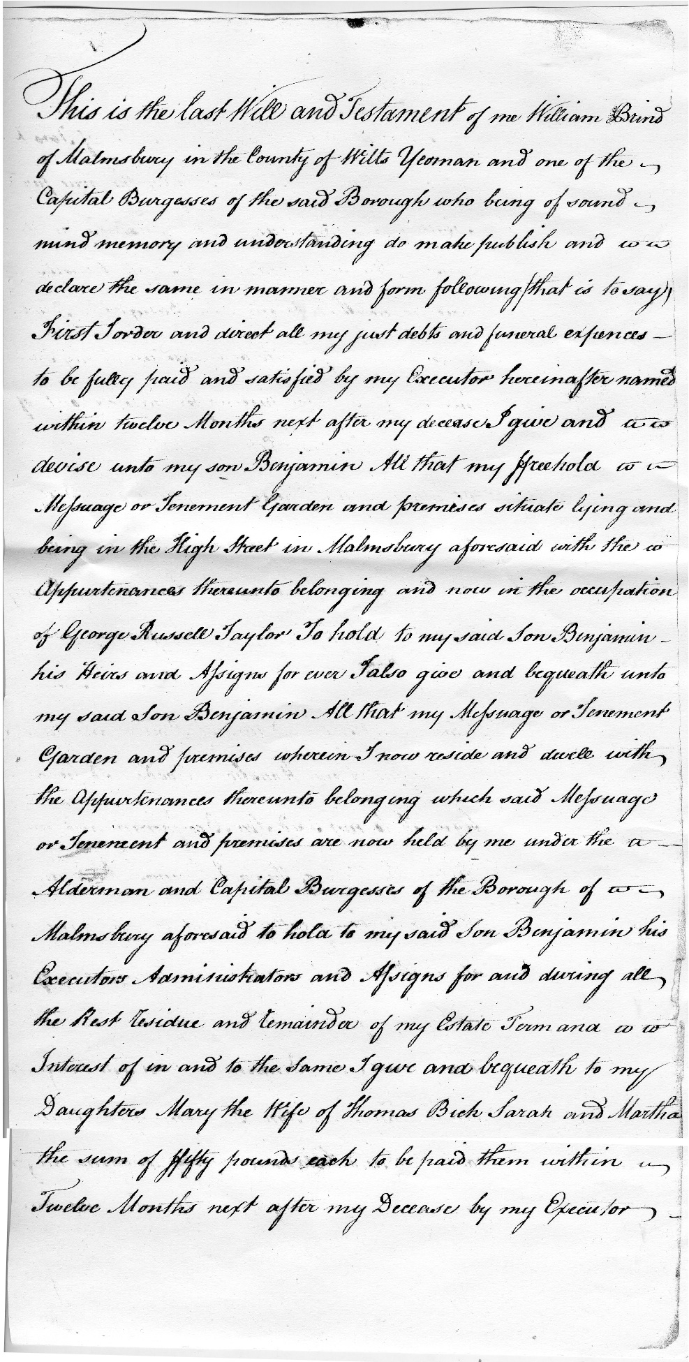 of Malmesbury in the County of Wilts Yeoman and one of the Capital Burgesses of the said Borough who being of sound mind memory and understanding do make publish and declare the same in manner and form following (that is to say) first I order and direct all my just debts and funeral expenses to be fully paid and satisfied by my Executor hereinafter named within twelve months next after my decease I give and devise unto my son Benjamin All that my freehold Messuage or Tenement Garden and premises situate lying and being in the High Street in Malmsbury aforesaid with the Appurtenances thereunto belonging and now in the occupation of George Russell Taylor To hold to my said son Benjamin his Heirs and Assigns for ever I also give and bequeath unto my said son Benjamin All that my Messuage or Tenement Garden and premises wherein I now reside and dwell with the appurtenances thereunto belonging which said Messuage or Tenement and premises are now held by me under the Alderman and Capital Burgesses of the Borough of Malmsbury aforesaid to hold to my said son Benjamin his Executors Administrators and Assigns for and ???? all the Rest resident and remainder of the Estate Term and Interest of in and to the same I give and bequeath to my Daughters Mary the wife of Thomas Bick Sarah and Martha the sum of fifty pounds each to be paid them within Twelve Months next after by Decease by my Executor |