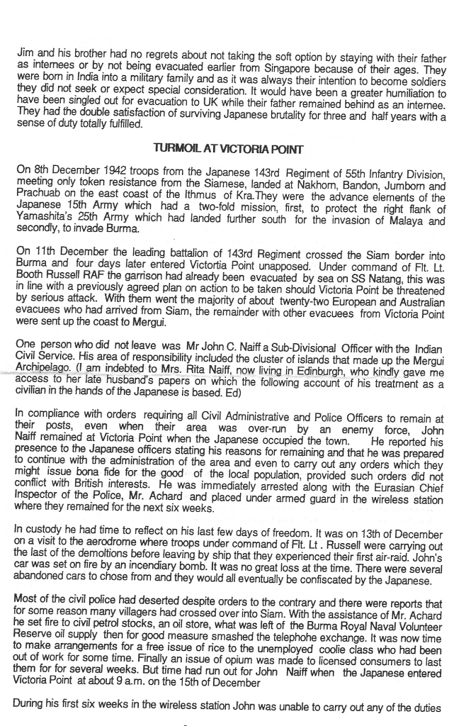 Jim and his brother had no regrets about not taking the soft option by staying with their father as internees or by not being evacuated earlier from Singapore because of their ages. They were born in India into a military family and as it was always their intention to become soldiers they did not seek or expect special consideration. It would have been a greater humiliation to have been singled out for evacuation to UK while their father remained behind as an internee. They had the double satisfaction of surviving Japanese brutality for three and a half years with a sense of duty totally fulfilled. |