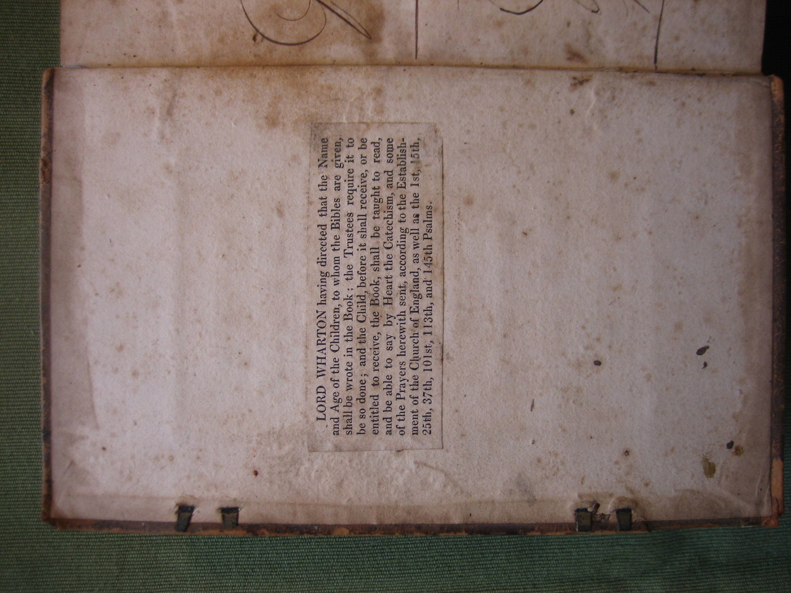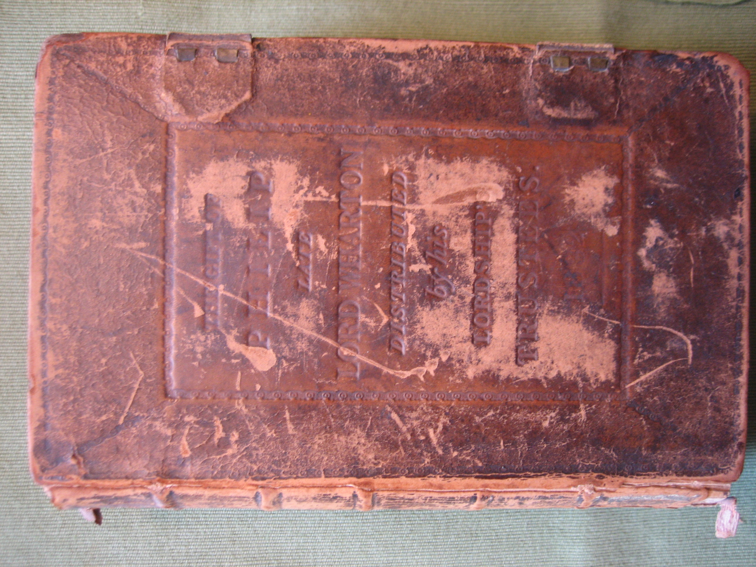 | From: Tim Gates Date: 9 May 2016 at 17:46 Subject: Re: Henrietta Brooks Jonathan Thanks for your response. The Bible is a thick octavo, bound in leather and measuring 200mm x 130mm x 60mm thick. Originally it was fastened by two brass clasps (now broken). Philip, lord Wharton, 4th Baron Wharton (1613-96), was a devout Protestant who left money in his will to pay for bibles to be distributed by his trustees. This is one such example. | |