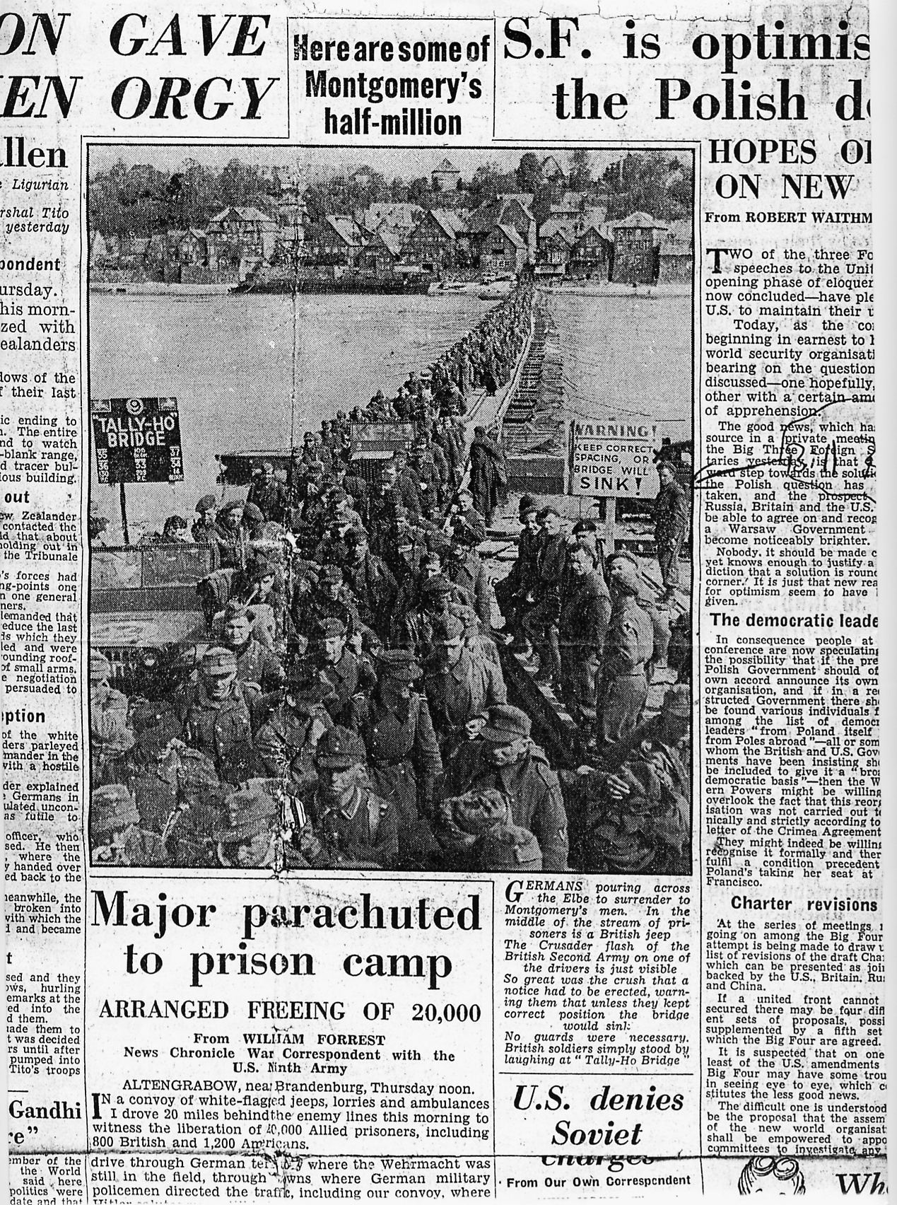 No guards were necessary. British soldiers simply stood by laughing at "Tally-Ho Bridge". News Chronicle Fri May 4th 1945. My grandfather (William Charles Brind) was photographed guarding POWs. Admittedly he is a distance from the camera but he later confirm that it was him. Justin Taylor (justinius1@hotmail.com). |