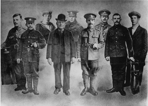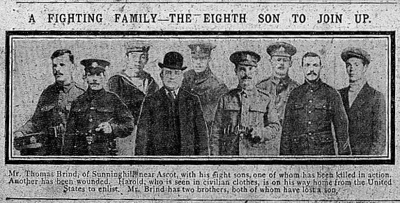 A FIGHTING FAMILY-- THE EIGHTH SON TO JOIN UPMr Thomas Brind, of Sunninghill, near Ascot, with his eight sons, one of whom has been killed in action. Another has been wounded. Harold, who is seen in civilian clothes, is on his way home from the United States to enlist. Mr Brind has two brothers, both of whom have lost a son. Daily Mirror, February 8, 1917. The cutting says at the bottom: "Printed and Published by The Pictorial Newspaper Co (1910) Ltd at The Daily Mirror Offices, 23-29 Bouverie-street, London, E.C. --- Thursday, February 8, 1917."