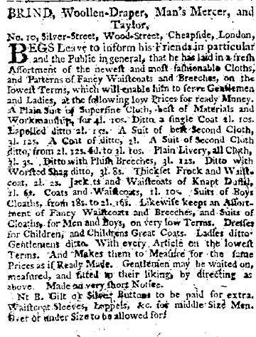 BRIND, Woollen-Draper | The Times???? 9-6-1786. |