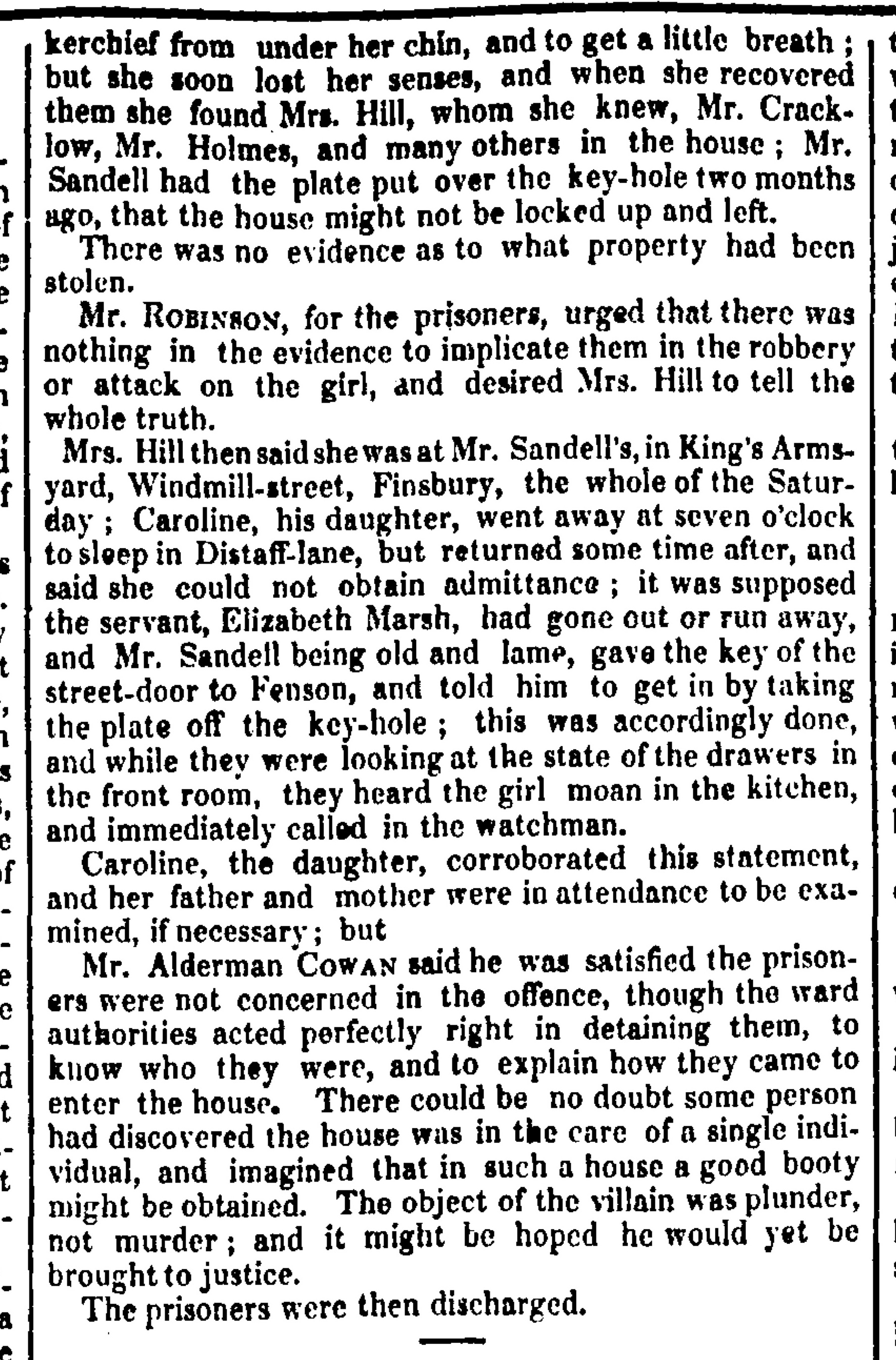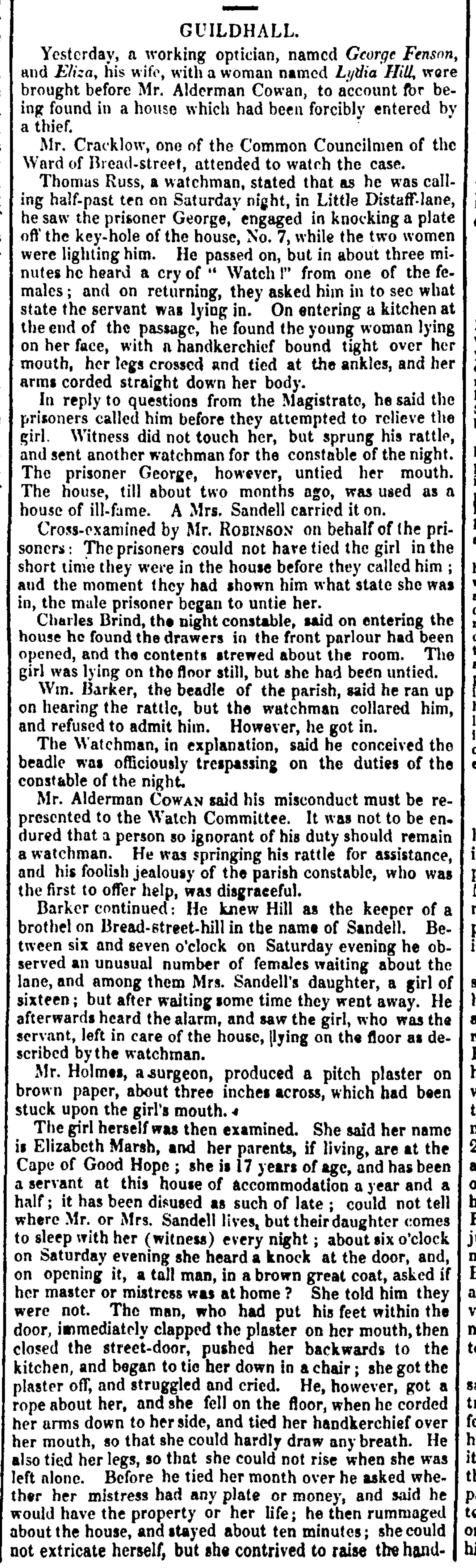 Yesterday, a working optician, named George Fenson, and Eliza, his wife, with a woman named Lydia Hill, were brought before Mr. Alderman Cowan, to account for being found in a house which had been forcibly entered by a thief. Mr Cracklow, one of the Common Councilmen of the ward of Bred-street, attended to watch th case. Thomas Russ, a watchman, stated that as he was calling half-past ten on Saturday night, in Little Distaff-lane, he was the prisoner George, engaged in knocking a plate off the key-hole of the house, No. 7, while the two women were lighting him. He passed on, but in about three minutes he heard a cry of :Watch!" from one of the females; and on returning, they asked him to see what state the servant was lying in. On entering a kitchen at the end of the passage, he found the young woman lying on her face, with a handkerchief bound tight over her mouth, her legs crossed and tied at the ankles and her arms corded straight down her body. In reply to questions from the Magistrate, he said the prisoners called him before they attempted to relief the girl. Witness did not touch her, but sprung his rattle, and sent another watchman for the constable of the night. The prisoner George, however, untied her mouth. The house, till about two months ago, was used as a house of ill-fame. A Mrs Sandell carried it on. Cross-examined by Mr Robinson on behalf of the prisoners: The prisones could not have tied the girl in the short time they were in the house before they called him; and at the moment they had shown him what state she ws in, the male prisoner began to untie her. Charles Brind, the night constable, said on entering the house he found the drawers in the front parlour had been opened, and the contents strewed about the room. The girl was lying on the floor still, but she had been untied. Wm. Barker, the beadle of the parish, said he had ran up on hearing the rattle, but the watchman collared him, and refused to admit him. However, he got in. The Watchman, in explanation, said he conceived the beadle was officiously traspassing on the duties of the constable of the night. Mr Alderman Coan said his misconduct must be represented to the Watch Committee. It was not be endured that a person so ignorant of his duty should remain a watchman. He was springing his rattle for assistance, and his foolish jealously of the parish constable, who was the first to offer help, was disagraceful. Barker continued: He knew Hill as the keeper of a brothel on Bread-street-hill in the name of Sandell. Between six and seven o'clock on Saturday evening he observed an unusual number of females waiting about the lane, and among them Mrs Sandells daughter, a girl of sixteen; but after waiting some time they went away. He afterwards heard the alarm, and saw the girl, who was the servant, left in care of the house, lying on the floor as described by the watchman. Mr Holmes, a surgeon, produced a pitch plaster on brown paper, about three inches across, which had been stuck upon the girl's mouth. The girl herself was then examined. She said he name is Elizabeth Marsh, and he parents, if living, are at the Cape of Good Hope; she is 17 years of age, and has been a servant at this house of accommodation a year and a half; if has been disuwed as such of late,; could not tell where Mr. or Mrs. Sandell lives, but their daughter comes to sleep with her (witness) every night; about six o'clock on Saturday evening she heard a knock at the door, and, on opening it, a tall man, in a brown great coat, asked if her master or mistress were at home? She told him they were not. The man, who had put his feet within the door, immediately clapped the plaster on her mouth, then closed the street-door, pushed her backwrds to the kitchen, and begn to tie her down in a chari; she got the plaster off, and struggled and cried. He, however, got a rope about her, and she fell on the floor, when he corded her arms down to her side, and tied her handkerchief ove her mouth, so that she could hardly draw any breath. He also tied her legs, so that she could not rise when she was left alone. Before he tied her mouth over he asked whether her mistress had any plate or money, and said he would have the property or her life; he then rummaged about the house, and stayed about ten minutes; she could not extricate herself, but she contrived to raise the handkerchief from under he chin, and to get a little breath but she soon lost her senses, and when she recovered she found Mrs Hill, whom she knew, Mr Cracklow, Mr Holmes, and many others in the house; Mr Sandell had the plate put over the key-hole two months ago, that the house might not be locked up and left. There ws no evidence as to what property had been stolen. Mr Robinson, for the prisoners, urged that there was nothing in the evidence to implicate them in the robbery or attack on the girl, and desired Mrs Hill to tell the whole truth. Mrs Hill then said she was at Mr Sandell's, in King's Arms-yard, Windmill-street, Finsbury, the whole of the Saturday; Caroline, his daughter, went away at seven o'clock to sleep in Distaff-lane, but returned some time after, and she she could not obtain admittance; it was supposed the servant, Elizabeth Marsh, had gone our or run away, and Mr Sandell being old and lame, gave the key of the street-door to Fenson, and told him to get in by taking the plate off the key-hole; this was accordingly done, and while they were looking at the sstate of the drawers in the fron room, they heard the girl moan in the kitchen, and immediatly called in the watchman. Caroline, the daughter, corroborated this statement and her father and mother were in attendance to be examined, if necessary; but Mr Alderman Cowan said he was satisfied the prisoners were not concerned in the offence, though the ward authorities acted perfectly right in detaining them, to know who they were, and to explain how they came to enter the house. There could be no doubt sm person had discovered the hous