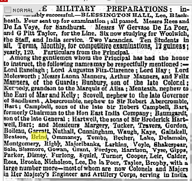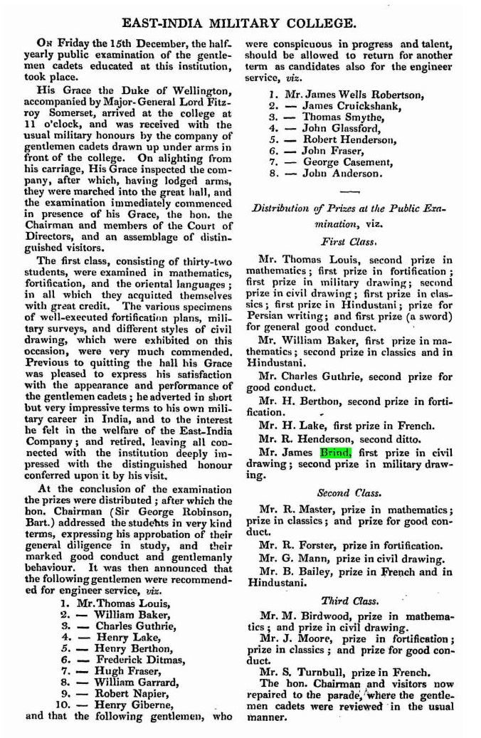 East-India Military College On Friday the 15th December, the half-yerly public examination of the gentlemen cadets educated at this institutiton, took place. His Grace the Duke of Wellington, accompanied by Major-General LordFitzroy Somerset, arrived at the college at 11 o'clock, and was received witht he usual military honours by the company of gentlement cadets drawn up under arms in front of the college. On alighting from his carriage, His Grace inspected the company, after which having lodged arms, they were marched into the great hall, and the examination immediately commenced in presence of his Grace, the hon. the Chairman and members of the Court of Directors, and an assemblage of distinguished visitors. Mr James Brind, first prize in civil drawing; second prize in military drawing. The Asiatic Journal (London, England), January 1, 1827 See Sir James RA? Sir James attended Addiscombe (the East India Military Seminary near Croydon) before going to India in 1827. |