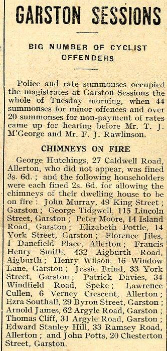 George Hutchings, 27 Caldwell Road, Allerton, who did not appear, was fined 3s 6d; and the following householders were each fined 2s 6d for allowing the chjimneys of their dwelling house to be on fire: Jessie Brind, 33 York Street, Garston See Jessie Rhoda (Murray) | |