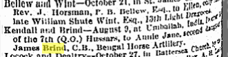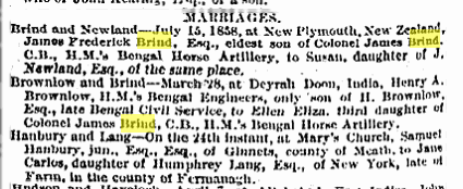 Brind and Newland-- July 15, 1858, at New Plymouth, New Zealand, James Frederick Brind, Esq son of colonel James Brind C.B. H.M.'s Bengal Horse Artillery, to Susan, daughter of J. Newland Esq. of the same place. Brownlow and Brind-- March 28 at Deyrah Doon, India, Henry A Brownlow, H.M.'s Bengal Engineers, only son of H Brownlow, Esq., late Bengal Civil Service to Ellen Eliza, third daughter of Colonel James Brind, C.B. H.M.'s Bengal Horse Artillery.