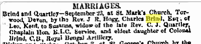 Brind and Quartley-- September 23, at St Mark's Church, Torwood, Devon, by the Rev J R Hogg, Charles Brind Esq. of Loo, Kent, to Susanna, widow of the late Rev. C J Quartley, Chaplain Hon. E. I. C. Services, and eldest daughter of Colonel Brind C.B., Royal Bengal Artillery.