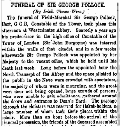 (By Irish Times Wire) The funeral of Field-Marshal Sir George Pollock, Bart, G.C.B., Constable of the Tower, took place this afternoon at Westminster Abbey. Scarcely a year ago his predecessor in the high office of Constable of the Tower of London (Sir John Burgoyne) was interred within the walls of that citadel, and in a few weeks afterwards Sir George Pollock was appointed by Her Majesty to the vacant office, which he held until his death last week. Long before the appointed hour the North Transept of the Abbey and the space allotted to the public in the Nave were crowded with spectatrs, the majority of whom were in mouring, and the great west door not being opened, large crowds of persons, who were unable to gain admittance, gathered around the doors and entrance to Dean's Yard. The passage through the cloisters was reserved for ticket holders, a large number of whom took their places within the choir. More than an hour before the arrival of the funeral procession, the friends of the deceased assembled.....