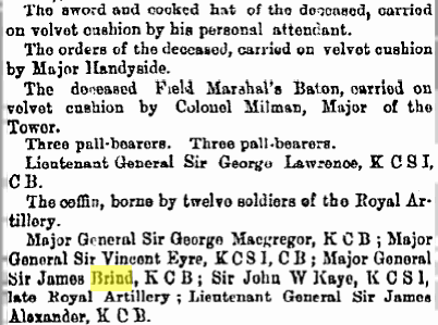 ...The sword and cocked hat of the deceased, carried on velvet cushion by his personal attendant. The orders of the deceased, carried on velvet cushion by Major Handyside. The deceased Field Marshal's Baton, carried on velvet cushion by Colonel Milman, Major of the Tower. Three pall-bearers. Lieutenant General Sir George Lawrence KCSI CB. The coffin, borne by twelve soldiers of the Royal Artillery. Major General Sir George Macgregor, KCB; Major General Sir Vincent Eyre, KCSI CB; Major General Sir James Brind, KCB; Sir John W Kaye, KCSI, late Royal Artillery, Lieutenant General Sir James Alexander, KCB.