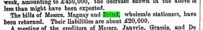 The bills of Messrs Magnay and Brind wholesale stationers, have been returned. Their liabilities are about £20,000.