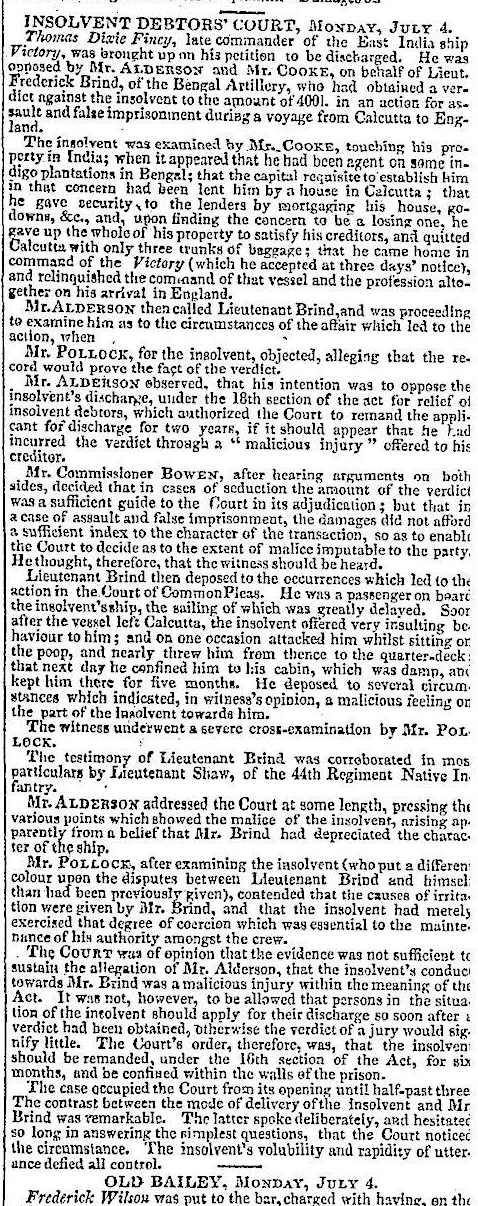 Thomas Dixie Finey, late commander of the East India ship Victory, was brought up on his petition to be discharged. He was opposed by Mr Alderson and Mr Cooke, on behalf of Lieut. Frederick Brind, of the Bengal Artillery, who had obtained a verdict against the insolvent to the amount of 400l. in an action for assault and false imprisonment during a voyage from Calcutta to England. The insolvent was examined by Mr Cooke, touching his property in India; when it appeared that he had been agent on some indigo plantations in Bengal; that the capital requisite to establish him in that concern had been lent him by a house in Calcutta; that he gave security to the lenders by mortgaging his house, go downs, &c, and, upon finding the concern to be a losing one, he gave up the whole of his property to satisfy his creditors, and quitted Calcutta with only three trunks of baggage; that he came home in command of the Victory (which he accepted at three days' notice) and relinquished the command of that vessel and the profession altogether on his arrival in England. Mr Alderson then called Lieutenant Brind, and was proceeding to examine him as to the circumstances of the affair which led to the action, when Mr Pollock, for the insolvent, objected, alleging that the record would prove the fact of the verdict. Mr Alderson observed that his intention was to oppose the insolvent's discharge, under the 18th section of the act for relief of insolvent debtors, which authorised the Court to remand the applicant for discharge for two years, if it should appear that he had incurred the verdict through a "malicious injury" offered to his creditor. Mr Commissioner Bowen, after hearing arguments on both side, decided that in cases of seduction the amount f the verdict was a sufficient guide to the Court in its adjudication; but that in a case of assault and false imprisonment, the damages did not afford a sufficient index to the character of the transaction, so as to enable the Court to decide as to the extent of malice imputable to the party. He thought, therefore, that the witness should be heard. Lieutenant Brind then deposed to the occurrences which led to the action in the Court of Common Please. He was a passenger on board the insolvent's ship, the sailing of which was greatly delayed. Soon after the vessel left Calcutta, the insolvent offered very insulting behaviour to him; and one one occasion attacked him whilst sitting on the poop, and nearly threw him from thence to the quarter deck' that next day he confined him to his cabin, which was damp and kept him there for five months. He deposed to several circumstances which indicated, in witness's opining, a malicious feeling on the past of the insolvent towards him. The witness underwent a severe cross examination by Mr Pollock. The testimony of Lieutenant Brind was corroborated in most particulars by Lieutenant Shaw, of the 44th Regiment Native Infantry. Mr Alderson addressed the Court at some length, pressing the various points which showed the malice of the insolvent, arising apparently from a belief that Mr Brind had depreciated the character of the ship. Mr Pollock after examining the insolvent (who put a different colour upon the disputes between Lieutenant Brind and himself than had been previously given) contended that the causes of the irritation were given by Mr Brind, and that the insolvent had merely exercised that degree of coercion which was essential to the maintenance of his authority amongst the crew. The course was of opinion that the evidence was not sufficient to sustain the allegation of Mr Alderson, that the insolvent's conduct towards Mr Brind was a malicious injury within the meaning of the Act. It was not, however, to be allowed that persons in the situation of the insolvent should apply for their discharge so soon after a verdict had been obtained, otherwise the verdict of a jury would signify little. The court's order, therefore was, that the insolvent should be remanded under the 16th section of the Act, for six months and be confined within the walls of the prison. The case occupied the court from its opening until half past three. The contrast between the mode of delivery of the insolvent and Mr Brind was remarkable. The latter spoke deliberately, and hesitated so long in answering the simplest questions, that the Court noticed the circumstances. The insolvent's volubility and rapidity of utterance defied all control | ||