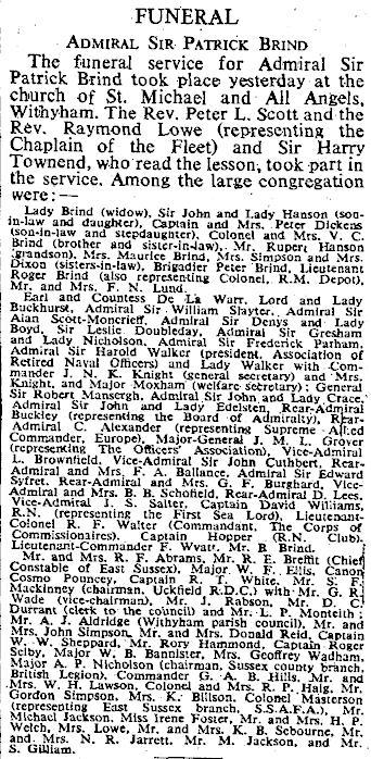 ![]() | FUNERAL Admiral Sir Patrick Brind The funeral service for Admiral Sir Patrick Brind took place uesterday at the church of St Michael and All Angels , Withyham. The Rev Raymond Lowe (representing the Chaplain of the Fleet) and Sir Harry Townend, who read the lesson, took part in the service among the large congregation were: Lady Brind (widow), Sir John and Lady Hanson (son-in-law and daughter), Captain and Mrs Peter Dickens (son-in-law and step daughter), Colonel and Mrs V C Brind (brother and sister-in law), Mr Rupert Hanson (grandson), Mrs Maurice Brind, Mrs Simpson and Mrs Dixon (sisters-in-law), Brigadier Peter Brind, Lieutenants Roger Brind (also representing Colonel, R.M. Depot) Mr and Mrs F N Lund. |