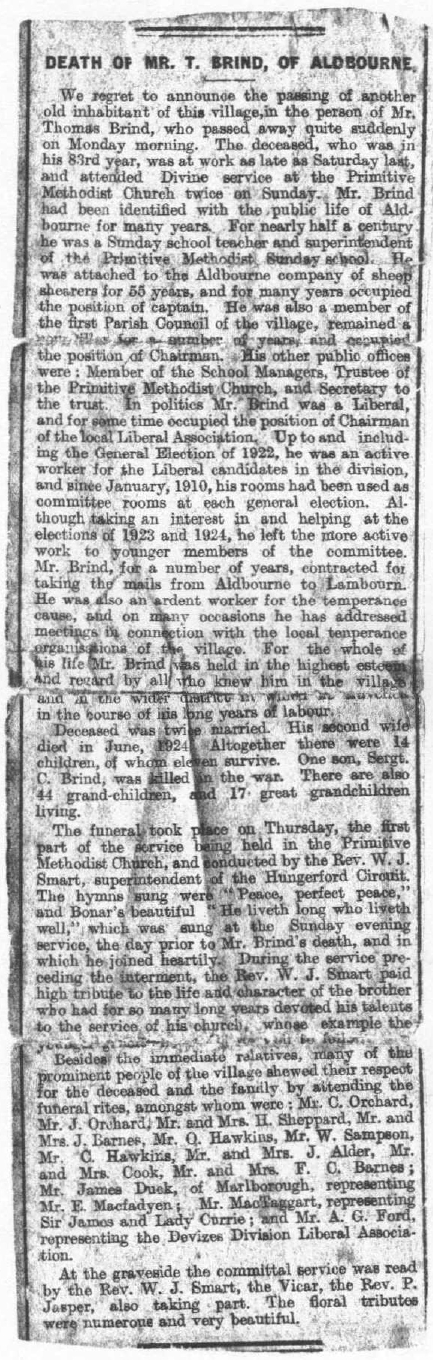 Death of Mr T Brind, of Aldbourne | Unknown newspaper in 1927 |