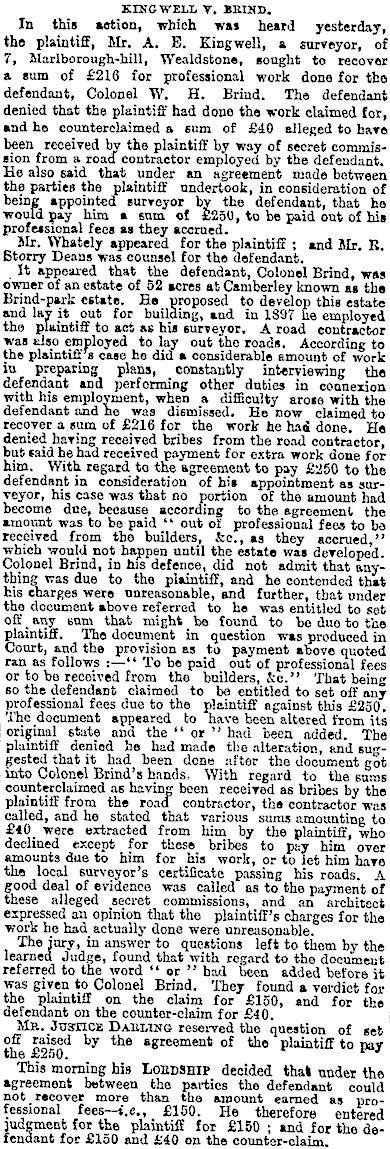 ![]() | Kingwell v Brind In the action, which was heard yesterday, the plaintiff, Mr A. E Kingwell, a surveyor, of 7, Marlborough-hill,. Wealdstone, sought to recover a sum of £216 for professional work done for the defendant, Colonel W. H Brind. The defendant denied that the plaintiff had done the work claimed for, and he counter claimed a sum of £40 alleged to have been received by the plaintiff by way of secret commission from a road contractor employed by the defendant. He also said that under an agreement made between the parties the plaintiff undertook, in consideration of being appointed surveyor by the defendant that he would pay him a sum of £250, to be paid out of his professional fees as the accrued. It appeared that the defendant, Colonel Brind, was owner of an estate of 52 acres at Camberley known as the Brind-park estate. H proposed to develop this estate and lay it out for building, and in 1897 he employed the plaintiff to act as his surveyor. A road contractor was also employed to lay out the roads. According to the plaintiff's case he did a considerable amount of work in preparing plans, constantly interviewing the defendant and performing other duties in connection with his employment, when a difficulty arose with the defendant and he was dismissed. He now claimed to recover a sum of £216 for the work he had done. He denied having received bribes from the road contractor but said he had received payment for extra work done for him. With regard to the agreement to pay £250 to the defendant in consideration of his appointment as a surveyor, his case was that no portion of the amount had become due, because according to the agreement the amount was to be paid "out of professional fees to be received from the builders, &c" That being so the defendant claimed to be entitled to set off any professional fees due to the plaintiff against this £250. |