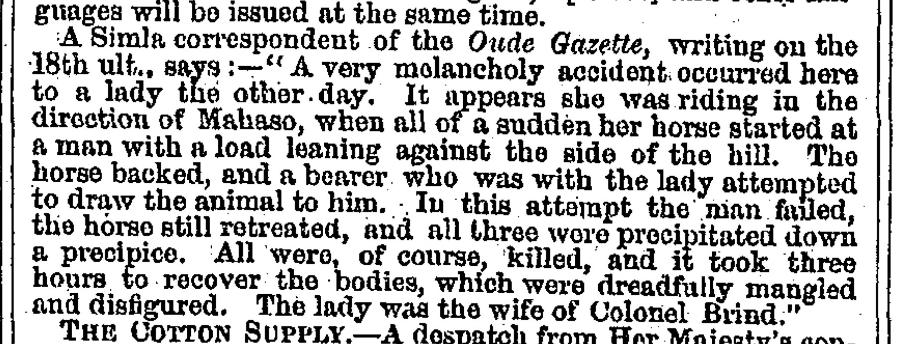 A Simla correspondent of the Oude Gazette, writing on the 18th ult., says :- "A very melancholy accident occurred here to a lady the other day. It appears she was riding in the direction of Mahaso, when all of a sudden her horse started at a man with a load lening against the side of the hill. The horse backed, and a bearer who was with the lady attempted to draw the animal to him. In this attempt the man failed, the horse still retreated, and all three were precipitted down a precipice. All were, of course, killed, and it took three hours to recover the bodies, which were dreadully mangled and disfigured. The lady was the wife of Colonel Brind." |