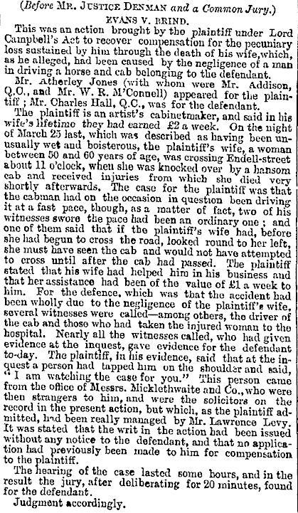 EVANS V BRIND This was an action brought by the plaintiff under Lord Campbell's Act to recover compensation for the pecuniary loss sustained by him through the death of his wife, which as he alleged, had been caused by the negligence of a man in driving a horse and cab belonging to the defendant. Mr Atherley Jones (with whom were Mr Addison QC and Mr W R M'Connell) appeared for the plaintiff; Mr Charles Hall, QC, was for the defendant. The plaintiff is an artist's cabinet maker and said in his wife's lifetime they had earned £2 a week. On the night of March 25 last, which was described as having been unusually wet and boisterous, the plaintiff's wife, a woman between 50 and 60 years of age, was crossing Endell-street about 11 o clock, when she was knocked over by a hansom cab and received injuries from which she died very shortly afterwards. The case for the plaintiff was that the cabman had on the occasion in question been driving it at a fast pace, though, as a matter of fact, two of his witnesses swore the pace had been an ordinary one,; and one of them said that if the plaintiff's wife had, before she had begun to cross the road, looked round to her left she must have seen the cab and would not have attempted to cross until after the cab had passed,. The plaintiff stated that his wife had helped him in his business and that her assistance had been of the value of £1 a week to him. For the defence, which was that the accident had been wholly due to the negligence of the plaintiff;s wife, several witnesses were called-- among others, the driver of the cab and those who had taken the injured woman to the hospital. Nearly all the witnesses called who had given evidence at the inquest, gave evidence for the defendant to-day. The plaintiff, in his evidence, said that at the inquest a person had tapped him on the shoulder and said "I am watching the case for you." This person came from the offices of Messrs Micklethwaite and Co, who were then strangers to him, and were the solicitors on the record in the present action, but which as the plaintiff admitted had been really managed by Mr Lawrence Levy. It was stated that the writ in the action had been issued without any notice to the defendant, and that no application had previously been made to him for compensation to the plaintiff. The hearing of the case lasted some hours and in the result the jury after deliberating for 20 minutes found for the defendant. Judgment accordingly. |