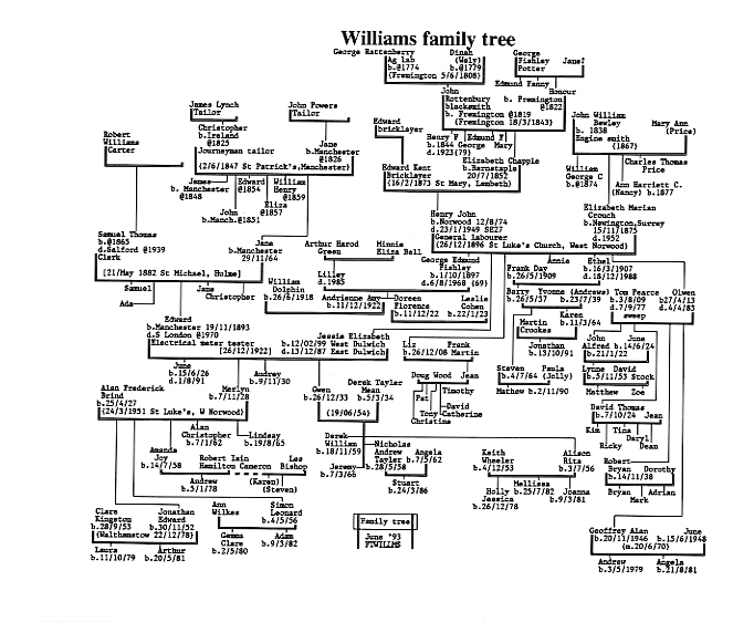 On the 12th of August 1874 Elizabeth Chapple and Edward Kent had a son, Henry John Kent, who was born at 1 Prospect Villa, Gipsy Road, Norwood. Gipsy Road is where my parents were living when I was born, though I was actually born in King's College Hospital. The family appears to have moved from Prospect Villa before the 1881 census was taken and at present I don't know if Henry John had any brothers or sisters. Henry John Kent married Elizabeth Marian Crouch Bewley on Boxing Day 1896 at St Luke's Church, West Norwood. Their son George Edmund Fishley Kent was born on the 1st of October in the following year. My grandmother, Jessie Elizabeth Kent, was born on the 12th of February 1899, possibly at Romany Road. "At one stage they all lived in Romany Road," my Mum told me. "I have got a strong feeling my mother was born in Romany Road." Jessie had several sisters including Liz (born on Boxing Day, 1908, her parent's Wedding Anniversary), Annie, Ethel and Olwen (born on April 27, 1913). Edward Williams met his wife to be, Jessie Kent, at TMC (Telephone Manufacturing Company) in Tritton Road, a turning off Clive Road. They both worked there during the First World War. "My Dad had been invalided out of the army and my Mum was working there," my Mum told me. "Half the people in Norwood worked there at one time. My Mum was putting Dope (possibly a cellulose type paint) on the wings of aeroplanes. My Dad was always very good with his hands. He may have been involved in aeroplane making." Mum doesn't know how her father met her mother but says: "Mum was the eldest of four or five girls. There was always a crowd of them." Perhaps they just met up, she suggests. Edward & Jessie courted for a long time before they got married and they were married for four years before they had their first daughter, June. Jessie Kent's father tried to talk her out of marrying Edward Williams because of his health. Doctors said Edward only had about a year to live. "She said 'never mind if I can have him for a year, I will'," my Mum told me. Edward & Jessie moved in with her parents at 57 Clive Road. The tenancy was in the name of Henry John Kent. My Mum says: "When grandfather died, which was just before we were married, they swapped the lease to grandmother. When grandmother died they wouldn't swap the tenancy again so mother and father were evicted. They got a flat in Canterbury Grove through the council because the council had taken over unoccupied premises. They (her parents) were actually council tenants though it wasn't council property and they were there till my father died." Mum remembers her grandmother, Elizabeth Marian nee Crouch Bewley as what they called a wise woman. "She had been taught it by her grandmother," she said. This wisdom was a knowledge of folk medicine. She would sometimes go out and nurse people. Mum also remembers her making toffee apples and cocounut ice for the children. "She was very good to us," she said. Clive Road only had an outside loo (a privy) and no bathroom. The plumbing was extremely basic and there was no running water upstairs. "My father paid for the electricity to be put in," said Mum. "We had gas only until I was about 10. ...the landlord point blank refused to do anything." The agents, who may have been Montague F Long or Veriyard & Yates, claimed that they had no power to do anything but collect the rent because the property was in Chancery, the subject of a dispute about a will. The rent was 15s a week. "Bear in mind my father was earning about £3 so it was a considerable rent," said Mum. The house no longer exists. It was demolished in the 1980s or early 1990s. Mum lived there from the day she was born until she got married, except when she was evacuated during the war. "I was only about 12 if that," she said. "We went to Ditchford in Gloucestershire... June must have been 14 and they wouldn't let her go to (the local school)...I went there for a while... Ditchford was a tiny hamlet, consisting of a farm, a pub and a few cottages. They lived in one of two cottages in the middle of a field. Mum recalls that they got billeting money, so it wasn't totally unauthorised. "My uncle Tom found an empty cottage in the middle of a field," she said. "My Aunt Olwen and the three boys they had then, and my mother went down by train and then we got a lift from the station (Moreton in the Marsh) on a big lorry." There were two women and seven small children in a cottage which had no water, no electricity, no gas, no anything. "We had to pump the water," she said. "The pump was on the sink in the house." "The funny thing is that the people who lived in the next door cottage, their name was Kent," Mum said. "They were evacuees too." The Education authorities were not happy about the arrangement saying that June should have been attending school at Stratford on Avon. "The education authority said they would give us bicycles but my mother said no way would we bicycle 14 miles there and back," Mum says. "So we were then sent to Reigate." At Reigate there was a proper Grammar School but they didn't get on with the locals. Mum says they were "too insular". "They didn't like us being there," she said. "They used to call us 'them refugees'. They wouldn't let us have sweets in the shops. They used to say 'they're for local children'. "The people I stayed with the woman was a bitch, (Mrs Snashfold). She hated kids. She didn't want any and she didn't want us." Honour Oak, the West Norwood school, moved to Reigate County Girls where the two schools shared facilities. Both schools had to offer part time education. "We had to go all day Saturday and got all day Monday off," Mum said. "In summer we used to have a lot of lessons out on the grass." Later the school took over a large house called Rosemead and the evacuees went there for lessons. Mum became ill: "I was taken to hospital and when I came out of hospital my mother came and took me and I went home and then June moved in and stayed the r