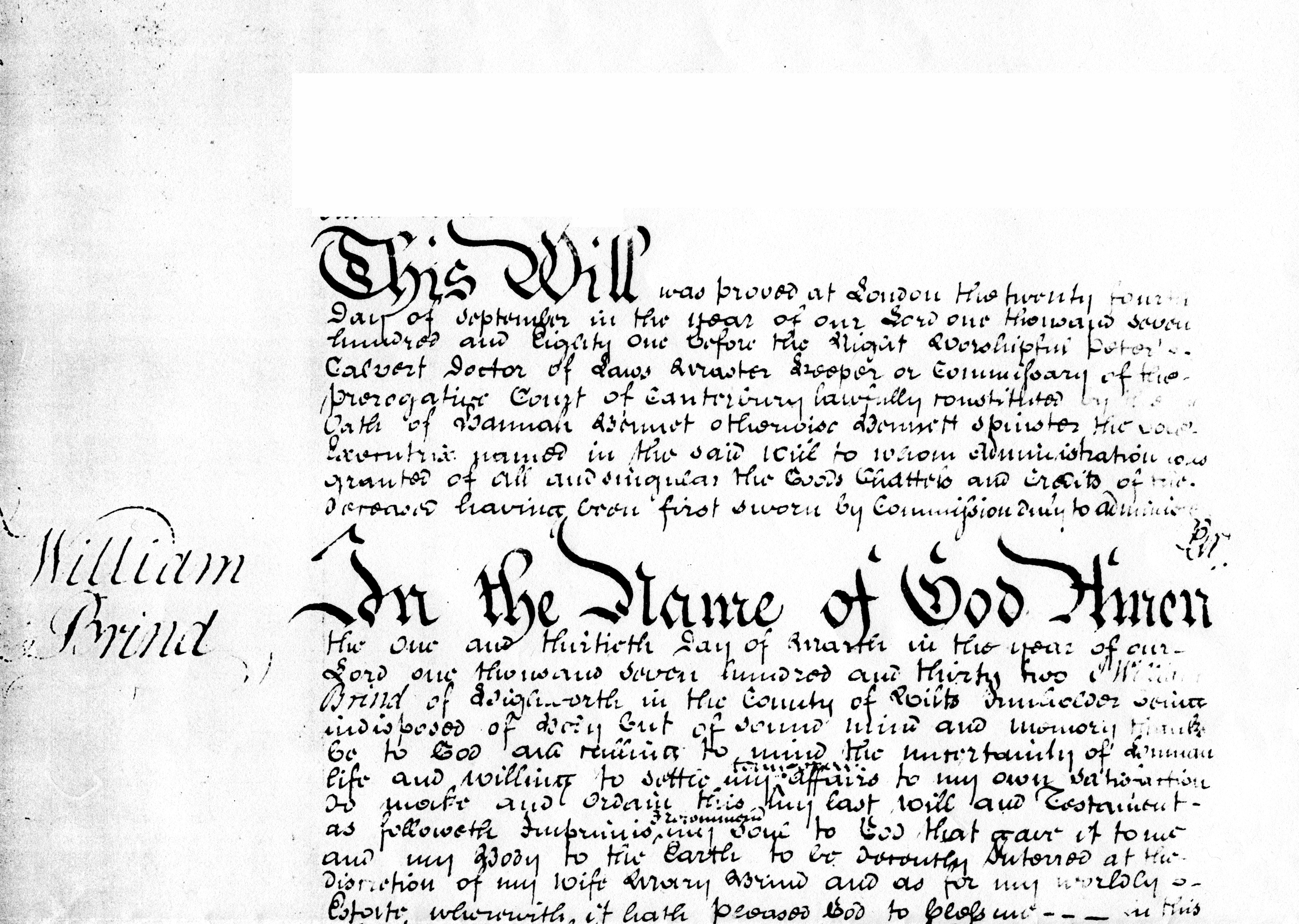 In the name of God Amen. This one and thirtieth day of March in the year of our Lord one thousand seven hundred and thirty two, I William Brind of Highworth in the County of Wilts Innholder being indisposed of Body but of sound mind and memory thanks be to God and calling to mind the uncertainty of Human Life and willing to settle my temporal affairs to my own satisfaction do make and ordain this my last will and testament as followeth the Imprimis I commend my soul to God that gave it to me and my body to the Earth to be devoutly interred at the discretion of my wife Mary Brind {{crossed out, 'Executors and Executrix herein after named}} and as for my worldly estate wherewith it hath pleased God to bless me in this life I dispose of the same in manner following. I give and bequeath unto my son Henry Brind the sum of ten pounds of lawful money of Great Britain when he shall attain his age of one and twenty years. Item I give and bequeath unto my son Walter Brind the sum of ten pounds of like lawful money to be paid to him when he shall attain his age of one and twenty years. Item I give and bequeath unto my said wife Mary Brind my inn in Highworth aforesaid called and known by the name of the Crown with all and every the appurtenances there unto belonging to hold to her the said Mary for and during the term of her natural life (or day of marriage which shall first happen) and after her decease (or day of marriage) then the said inn to be disposed of and the purchase money to be equally divided between my five children, viz Henry, Walter Thomas, William and Ann Brind or between so many of them as are then living and likewise my wife Mary shall have the use of all my household goods until my said executors and executrix shall be of the age of one and twenty years (provided that she do not marry again). And lastly I do nominate constitute and appoint, make and ordain my sons Thomas Brind, William Brind and my daughter Ann Brind joint executors and executrix of this my last will and testament revoking and disannulling and making void all former wills and testaments by me made and done ratifying and confirming this and no other to be my last will and testament and all my goods and chattels and effects in possession and reversion (except what is before bequeathed) shall be to the use and behoof of my said executors and executrix share and share alike and I do devise request and appoint and nominate my brother in law Henry Coleman of Highworth and Thomas Carter of Cricklade St Sampson to be overseers of this my last will and testament and to see the same performed according to the intent hereof and my desire in willing whereof I have here unto set my hand and seal the day and year first above written, William Brind. Signed sealed published pronounced and declared by the above named William Brind to be his last will and testament in the presence of us who subscribed our names in the presence of the testator. D Marsh, John Probetts, James Potts. On the Wiltshire version it says:-- At Highworth 6th May 1732, Maria Brind, sworn before Ja:Ayscough surr. On the version in the PRO, which is the real will, there is the note on the right at the bottom:-- Thomas Brind the son of the deceased and the surviving executor within named was duly sworn as usual (and that the effects do not amount of £300) before me. (signature) F Simpson, surrogate. |