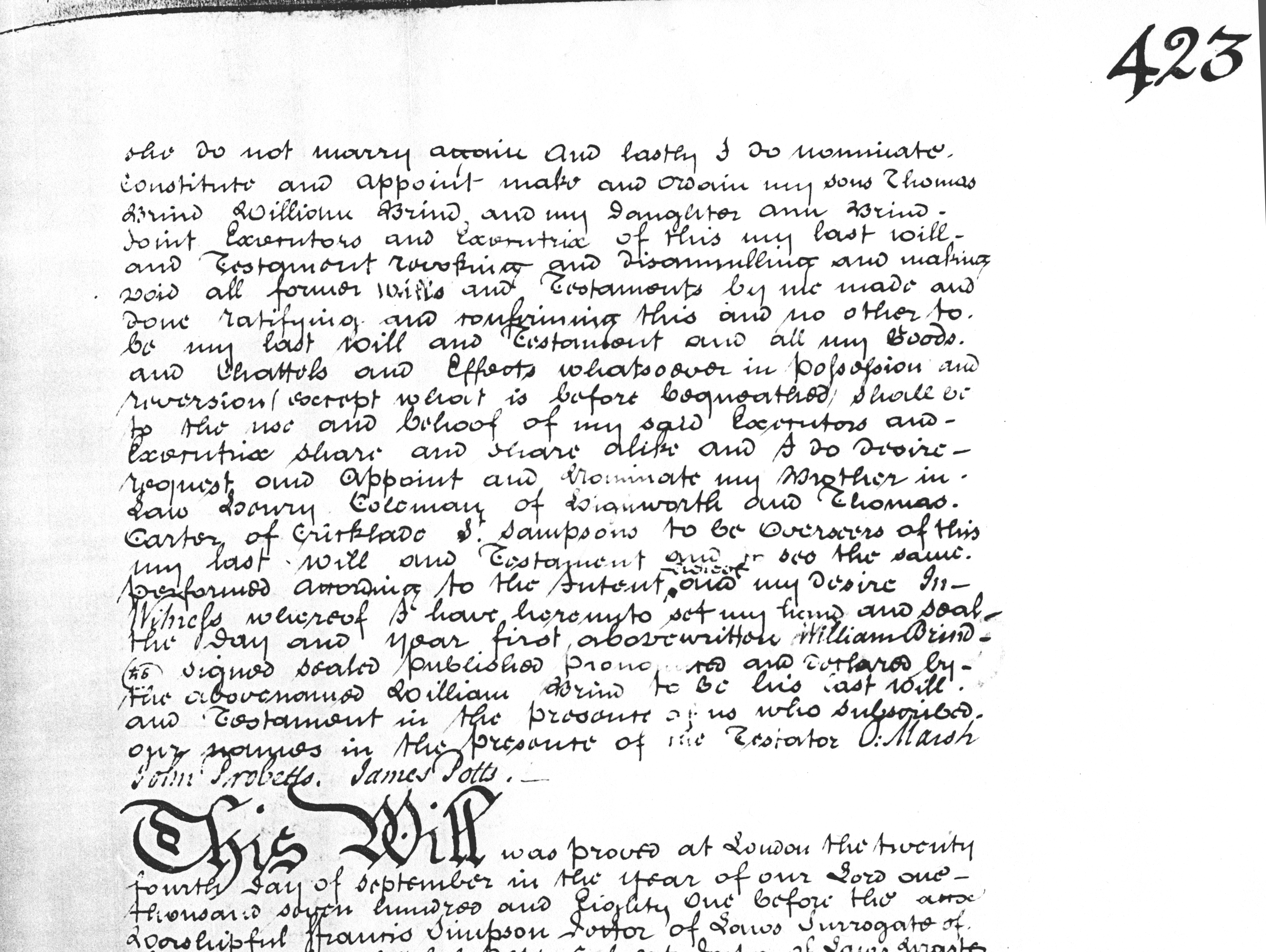 And this note on the left:-- Proved at London the 24th of September, 1781, before the worshipful Francis Simpson, Doctor of Laws, and surrogate, by the oath of Thomas Brind the son and the surviving executor to whom Admon (administration) was granted, he having been first sworn duly to administer. On the bottom it says: "Testator was late of Highworth in the county of Wilts and died in 1732." On the back of the will it says: '1732 Highworth (39) The will of William Brind' Also at the Public Record Office is a copy of this will with the addendum: "This will was proved at London the twenty fourth day of September in the year of our Lord one thousand seven hundred and eighty one before the (gap) worshipful Francis Simpson Doctor of Laws Surrogate of the Right Worshipful Peter Calvert Doctor of Laws, Master Keeper or commissary of the Prerogative Court of Canterbury lawfully constituted by the Oath of Thomas Brind the son of the deceased and surviving executor named in the said will to whom administration was granted of all and singular the goods chattels and credits of the said deceased having been first sworn duly to administer." This is Prob 11/1081 423 (ff312) |
