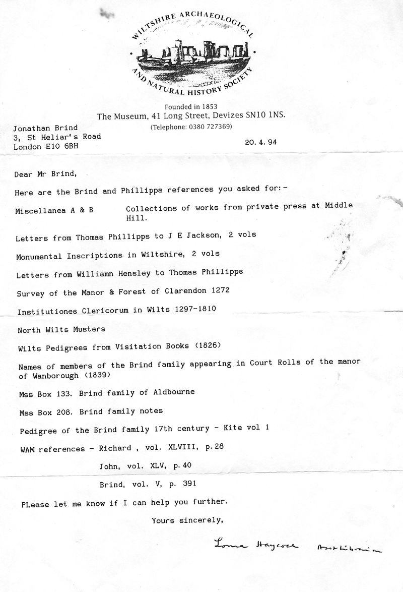 The society has a museum at 41 Long Street, Devizes SN10 1NS, phone 0380 727369. I asked them to give me information about anything they had on the Brinds and Sir Thomas Phillips. Lorna Haycock (I think that's her name, her signature isn't very readable) wrote back to say:--