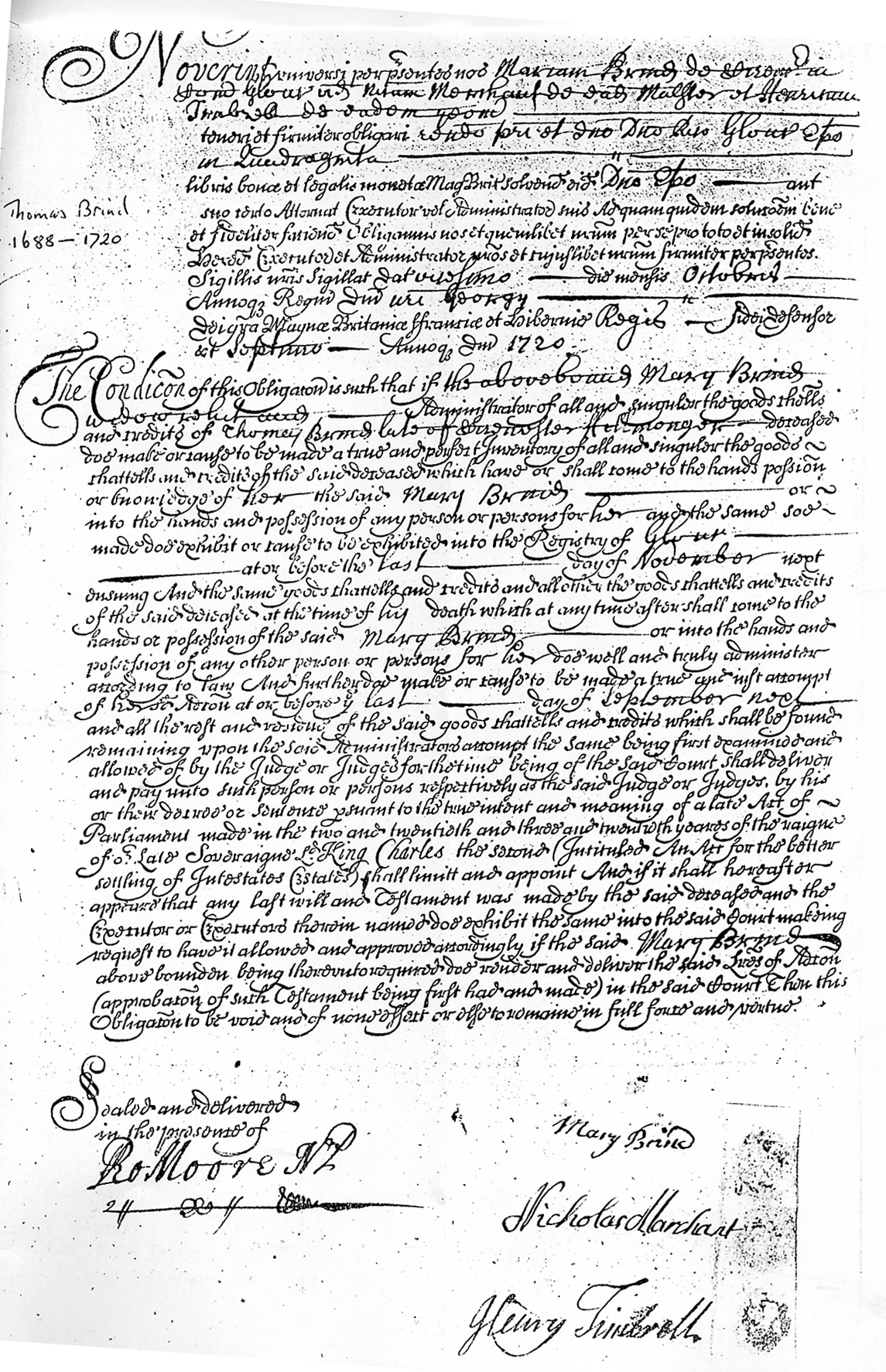 The condition of this obligation is such that if the above bound Mary Brind widow Relict and Administrator of all and singular the goods, cholls and credits of Thomas Brind late of .... Fellmonger hereafter doe make of cause to be made a true and perfect inventory of all and singular the goods and chattells and credits of the said deceased which have or shall come to the hands possion or knowledge of her the said Mary Brind--- or into the hands and possession of any person or persons for her and the same so made do exhibit or cause to be exhibited into the Registry of Glous --- at or before the last --- day of November next ensuing And the said goods chattells and credits and all other the goods chattells and credits of the said deceased at the time of his death which at any time after shall come to the hands or possession of the said Mary Brind---- or into the hands and possession of any other person or persons for her doe well and truly administer according to law And further doe make or cause of be made a true and inft attempt of her acrou at or before ye last date of Septembe next and all the rest and residue of the said goods chattells and credits which shall be found remaining upon the said administrators attempt the same being first examined and allowed of by the judge or judges for the time being of the said court shall deliver and pay unto such persons or person respectively as the said judge or judges his his or their ... or sentence persuant to the ... intent and meaning of a late Act of Parliament made in the two and twentieth and three and twentieth years of the raigne of the said Soveraigne Lord King Charles and Second (Intituled An Act for the better settling of Intestates (estates) shall limit and appoint And if it shall hereafter appear that any last will and testament was made by the said deceased and the Executor or Excutors therein named doe exhibit the same into the said court making above request to have it allowed and approved accordingly if the said Mary Brind above bound being thrown required doe and deliver the said Lords of Adcon (approbation of such Testament being first had and made) in the said court thou this obligation to be void and of none effect or or else to remain in full force and virtue. Sealed and delivered in the person of R Moore