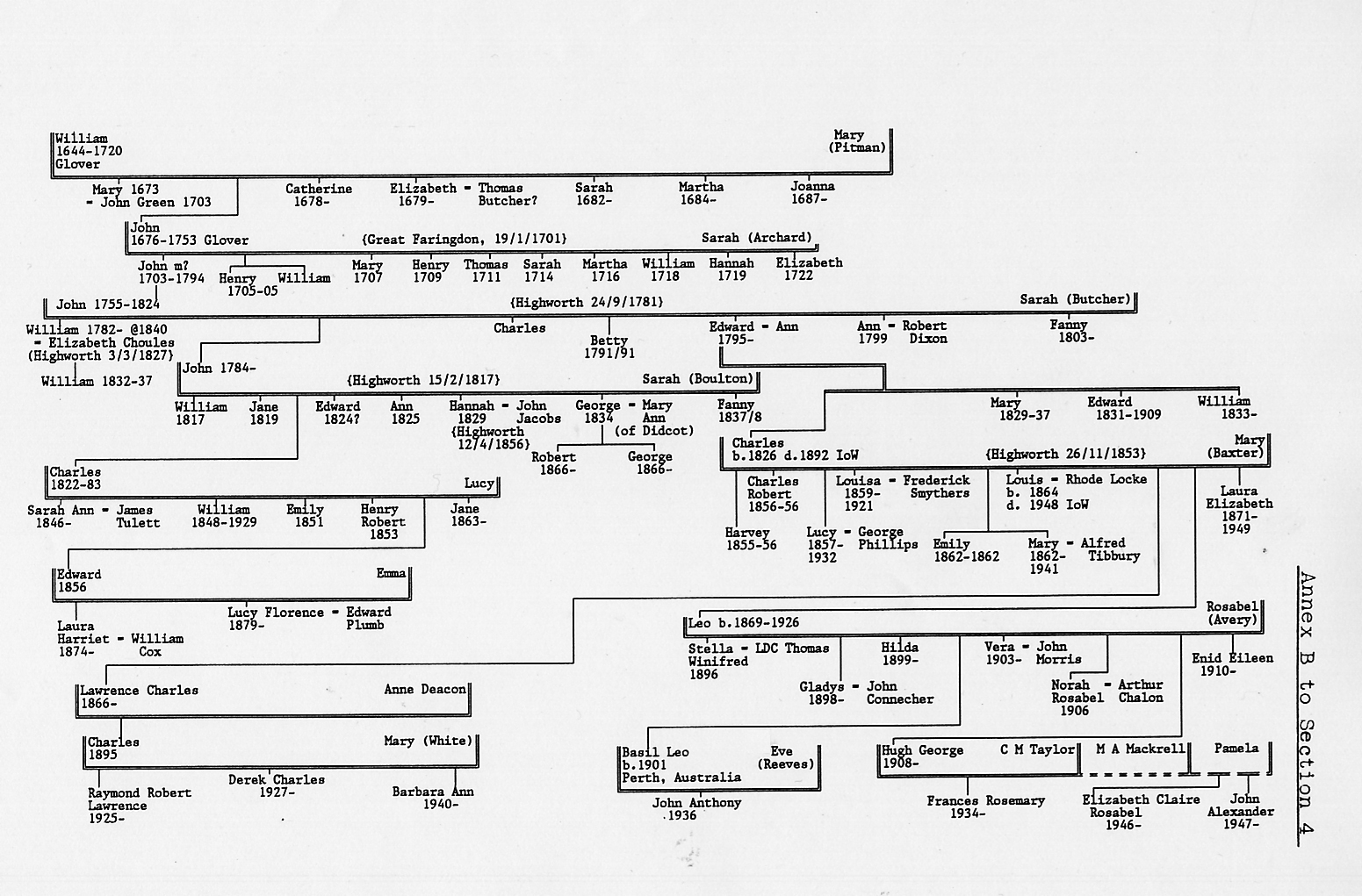 The following tree was produced by H.G. Brind in 1950. It is slightly doubtful that the John shown who was born in 1703 would have had a family at the age of 52 in 1755. William (Glover) John 1676-1753 John 1784-1853