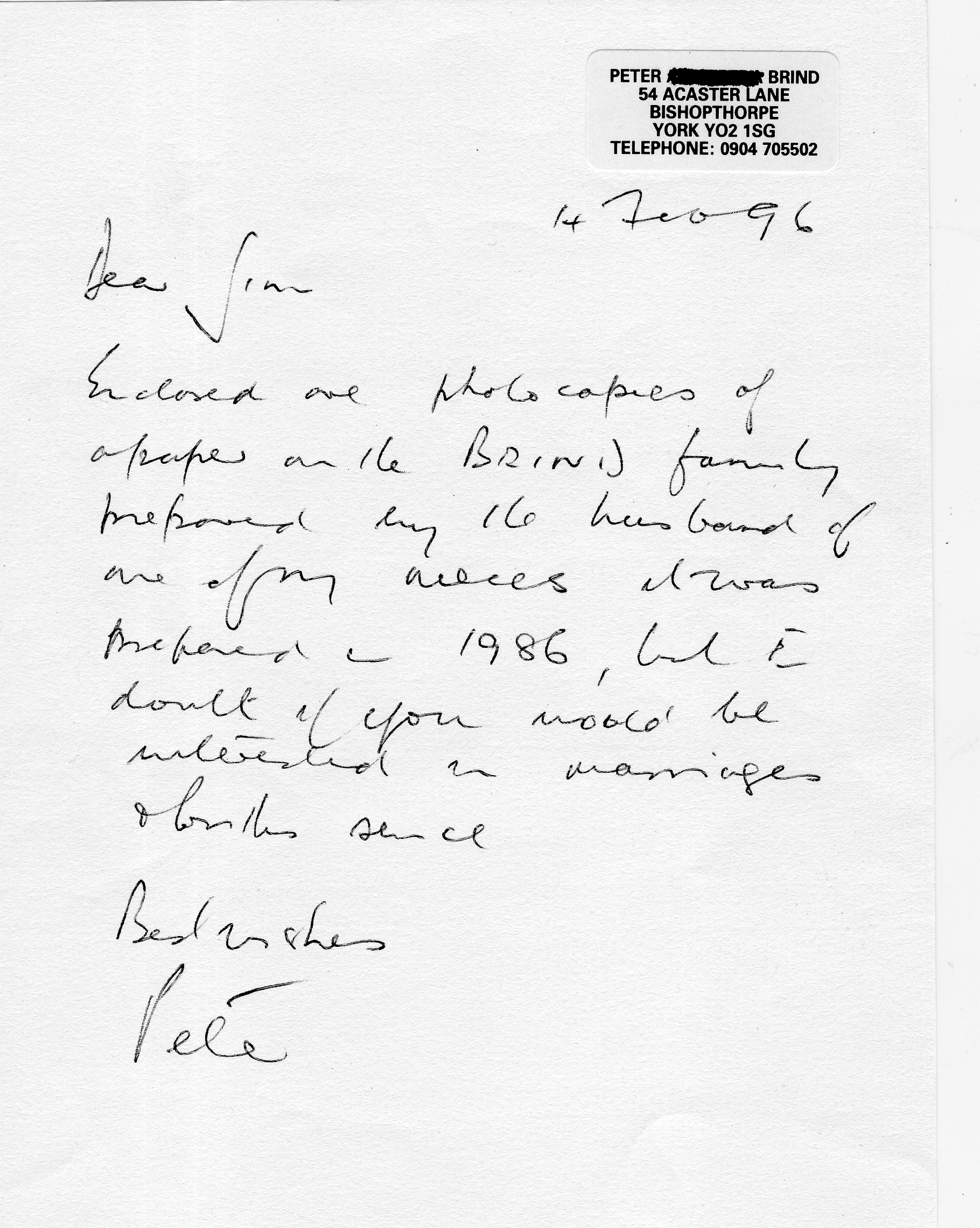 James and Elizabeth later moved north to Boston, Lincolnshire, and their subsequent family were brought up there. Robert and the remainder of his generation stayed in the Abingdon area and it was William, the son of Harry, who began the Brind-Gillingham company which has, alas, now disappeared. The descendants of this branch remain in the area to this day. FAMOUS SONS AND DAUGHTERS Each generation in any family produces those who leave their mark on both the local and national communities. So it has proved with the Brind family. The Dictionary of National Biography has only scant details of the career of Richard Brind who was the organist at St Paul's Cathedral from 1707-1718. He first appears at St Paul's as a chorister under Jeremiah Clarke and it was after Clarke's death that he took over as organist. Richard is recorded as having written two thanksgiving anthems, the records of which have regrettably been lost. To his detriment, however, Hawkins in his History of Music of 1853 comments:-- "Brind seems to have been no very remarkable performer." Irrespective of Hawkins opinion it is very interesting to reflect that it was during Richard's time that Handel frequently took his place at the organ at St Paul's. Richard died in March 1718 and was buried in the vaults of the cathedral on the 18th of that month and the thought that he died at an early age is rather confirmed by the fact that administration of his estate was granted to his father, also Richard, on the 7th April, 1718. A useful genealogical source is the "Register of Wiltshire endowed charities" which was published in 1908. This publication continues the Wanborough thread as Margaret Brind, by her will of 1747, left a sum of £100 to the poor of Wanborough. The interest of this was to be given too poor widows. As younger sons left the ancestral village, new dynasties were created and the "Wiltshire endowed charities" records two further family philanthropists. Margaret Brind of Swindon by her will of 1740 left £100, the interest of which was to be paid annually on July 20th to the parish poor. The fund was combined in 1757 with one left by Mary Broadway and was used to buy land in Stratton St Margaret. The land was sold in 1884 and raised £1171 for the poor and £203 for widows. The annual income of the fund in 1903 was £15. William Brind of Liddington by his will of 1876 left £100 in trust, the income of which was to be used to provide an evening school for boys employed as farm labourers. The income was, in fact, used to maintain a reading room for boys until the charity was extended in 1887 to buy books for a lending library for the boys. The annual income of the fund in 1968 was some £2 per annum. No doubt there are other family members equally deserving of their place in history and research is continuing to ensure that this rightful place is filled. This paper was produced by the husband of one of the nieces of Peter Brind of 54 Acaster Lane, Bishopthorpe, York YO2 1SG, in 1986.