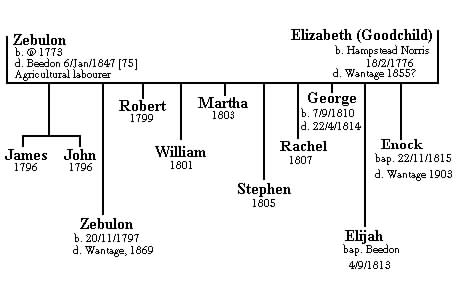 Enoch or Enock married Eliza and they lived in Stanmore. They had one son, Henry born on May 21, 1848. Eliza died a few years later and in 1856 Enoch married Emily, who was 22 years younger than him. Emily came from Hampton Norris and the couple moved away from Stanmore. The son of Zebulon and Betty we are most concerned with was Elijah (sometimes spelt Elijha). He was an agricultural labourer and lived all his life in Beedon. Elijah was illiterate but his wife Sarah could write. They lived south of Beedon by the kilns and close to Zebulon and Betty. Elijah had more children that his brother and sisters put together, ten in total. Zebulon and Betty had moved to a cottage close to the kilns when their own family had moved out. There were 126 people there in 26 cottages, all labourers of one kind or another. Zebulon owned the cottage which was rated at an annual value of £1 2s and he actually paid 17s a year rates. When Betty was 65 she and Zebulon were living with Elijah's three eldest children. In January 1848 the Rector paid out gifts of tea, bread and sugar to the value of £2 to 'receiving widows and infirm persons'. Betty wasn't a widow but she was on the list of recipients. She got about 2s worth.
