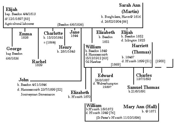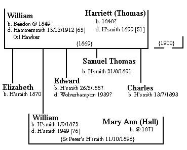 An article in the West London Observer of September 17, 1897, page 7, describes the Hammersmith of 1822, the year in which Joseph Senior was born. "Vignettes of Local History. The following extracts are taken from an old Gazetteer which reached its third edition in 1822. This is what is said about "Hammersmith "A village about three miles west from London. It has a church, several meeting houses and a nunnery....In Hammersmith Chapel is a bronze bust of Charles I under which in a marble urn is the heart of the loyal donor Sir Nicholas Crispe who invented the present mode of making bricks which were first used in building Bradenburgh (sic.) House. Here was buried Sir Samuel Morland mechanic inventor of the speaking trumpet in 1696; At Brandenburg (sic.) House, Hammersmith, on the 11th August 1821 died Caroline of Brunswick, Consort of George IV." A second article in the West London Observer of February 2, 1895, page 6, describes the Hammersmith of just a few years later. "On Monday evening a lecture was delivered by Mr Alfred Whitman of the Department of Prints and Drawings, British Museum, to a large assembly in the Broadway Congregational Church. The gathering was in connection with the Social and Literary Society and the Pastor, the Rev J L Brooks, presided. I can give you some account of this borough 60 years ago from the lips of my father, who came to Hammersmith to be apprenticed in 1834 three years before Queen Victoria came to the throne. At that time standing near the main road near where Addison Road railway bridge now stands and looking northwards an extensive view could be obtained as far as Kensal Green and Kilburn. By the North End Road stood the turnpike gate which was not removed until about 1860. A little to the west was the old 'Black Bull Inn' from which the London omnibuses started. The companion inn, the Red Cow, still remains. From Brook Green to Rowan Road was market garden and Rowan Road itself was a footpath between hedgerows. A florist's garden occupied the space where Nazareth House now stands and where are today the West London Hospital and Elm Grove was then a large house standing in its own grounds called Elm Tree House, a boarding school for ladies. Hammersmith Workhouse stood where we see the Latymer School and an old Benedictine Convent was to be found were the Roman Catholic College is. Round by the church was the thatched house of the neighbourhood, a good specimen of an old country house. The parish church was lighted with dazzling brilliance by common tallow candles and it was the duty of the beadle to go round and snuff them during the service. Orchards flourished on both sides of the Bridge Road and boys were kept at a safe distance by wooden fences. At the King Street end of the Grove was a Ladies School Grove Hall and from there to the Goldhawk Road were cornfields. On the west side of the entrance to the Windsor Castle Hotel was (and is) the old Ebenezer Chapel where Rowland Hill, among others, was accustomed to preach. At the time all travellers and merchandise had to journey by road. There were nearly a hundred four horse coaches up and down the main street during the day besides numerous wagons drawn by teams of six and eight horses; and in the evening about 9 o' clock eight mail coaches passed through the town on their way to the west. William IV was frequently to be seen going to Windsor and he always travelled over Hammersmith Bridge instead of through Brentford as at the latter place he was once insulted at the time of the Reform Bill. At the close of the lecture a very hearty vote of thanks was recorded to Mr Whitman." John and Sarah Catherine Brind were married at St Peter's Church, Hammersmith, on July 12, 1868, and had moved to 2 River Terrace, Hammersmith, by 1869, when John was born. The family continued to live here for more than a decade. On 23 June 1881 they moved to 7 Colvin Street, which is where John spent the rest of his life. Built in 1869 or 1870, Colvin Street ran from Glenthorne Road to some railway arches where the road came to a dead end. It was near King Street and Beadon Road. Colvin Street does not exist any more, it's a car park. Even so it's possible to find out a little bit about what life was like there in the 1890s from the 1891 census and the pages of the West London Observer. One common theme in these reports is the clothing trade. Martha Heard was a dressmaker, Henry Jones was a tailor. One of John and Sarah's daughters (Emma Louisa b 3/10/1884) went to Chelsea Polytechnic to study dress making and dress design. She worked for a dress making firm in London. She married George Louis Fasquelle in 1906. More personal information about what life was like in the Brind household is hard to come by but Chris Willmore tells the story that John would come home on a Friday night and would always bring kippers and regularly as clockwork his wife would hit him with the kippers. Victor (son of William George, John and Sarah's youngest son) said they were reasonably well off because they used to be able to buy food in quantity Chris Willmore also tells a family story about the two oldest boys Jack and Charlie, who she says were fair haired. One day Sarah was taking the two eldest boys back to Beedon to visit the grandparents. She was stopped while walking from the station and questioned because they were suspicious about a little dark haired woman who had these two tall blonde children. These blonde boys just didn't look as if they belonged to her. John could write but Sarah could not (she loved to have the children read books to her). The couple were determined to educate their children. Jack & Charlie (Teddy) the two eldest were sent to school. John and Sarah scrimped and saved to pay the fee, but by the time the younger ones came along (Nellie onwards) the School Board for London helped.