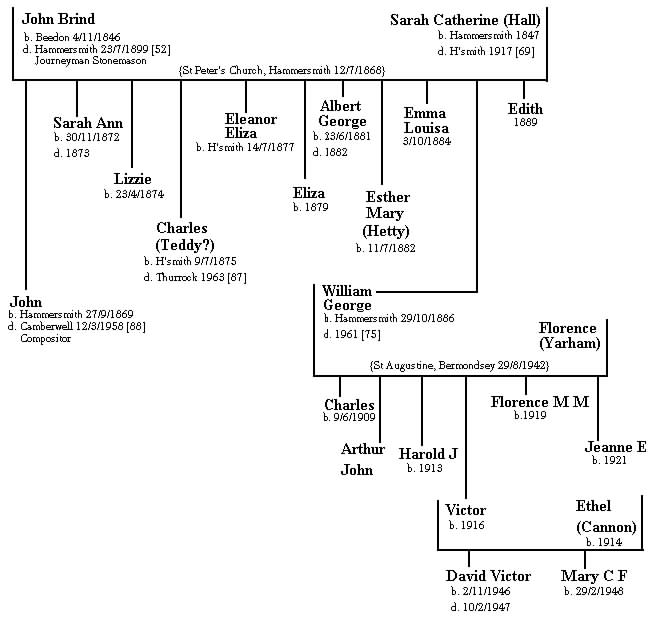 The Brinds,a family historyUp until a few years ago, I'd met very few Brinds. My parents, my grandmother (a Brind by marriage) and the odd one who came our way. One year a Michael Brind called at our house in Leyton to check our electoral register entry, or census data, or some such thing. Perhaps he decided to call on us because we were Brinds? Another time I spoke to a woman who told me she had been to school with a girl called Jo Brind, but lately I've wondered if she meant Jo Brand, the famous English comedian. My father also told a story about a television repair shop he went into when we lived in Bow in about 1960. He hadn't ever been there before and he hadn't given his name or address but the man behind the counter said: "Right Mr Brind shall we deliver the set?" Evidently there were some Brinds who looked like us somewhere nearby. This was about all I knew when I embarked on the quest to trace the history of the Brinds. Like the Quest for the Holy Grail, this venture has no ending. There probably never was a single original Brind and even if there was it's unlikely he ever left any records. But the quest has brought to light one or two interesting facts and a host of cousins: notably Chris Willmore, who did so much of the work this history is based on. The BrindsMost surname dictionaries (there are several) associate Brind and similar sounding names (Brent, Brend etc.) with the medieval practice of burning or branding criminals. Some books say he was the person doing the branding, others that he was one of the branded. A few of the surname guides also point out that Brend was the word for burnt land. Brend could have been a dweller on burnt land, in the era of slash and burn cultivation. Some guides also suggest the name could have a geographical origin, a native of the village of Brind in the East Riding of Yorkshire. Our family probably originates in Berkshire or the adjoining county of Wiltshire, not Yorkshire. Check through the birth certificates of Brinds born in the nineteenth century and you'll find that many of them were born in Berkshire/ Wiltshire. If there is a Yorkshire connection it is probably lost in the mists of history, but it could explain why some Brinds are a little blunt! One theory puts the Yorkshire connection (the Hamlet of Brind) and the burnt land together. This goes something along these lines: Brind is listed in A H Smith's The Placenames of the East Riding of Yorkshire and York (English Placename Society Vol XIV. He states that it derives from the Middle English 'brende' meaning 'burnt' used as a substantive of 'a place cleared (or destroyed) by burning' and that a mutated form of the Old English 'brand' meaning 'the act or result of burning' might also be a possibility. He also lists variatioons of spelling: Brend(e) appeared in 17788-91, La Brend in 1254, Le Brend(e) in 1289, Brand in 1316, Brynd(e) in 1432 and Burne in 1650. Outlines of English History, page 23, points out that between 1068-69 'The Great rising of the Saxons in the North under the two great Saxon chiefs, Edwin and Morcar, assisted by the Danes under Sweyn. William re-took York, bought off the Danish fleet and ravaged the country between the Humber and the Tees. So complete was the devastation that this part of the country was marked "waste" in the Doomesday Book... Most of the land belonging to the Saxons was confiscated and given to the Norman Barons.; This devastation could have taken the form of burning and could have resulted in the hamlet of Brind getting its name. However, a lot more work needs to be done on this theory if it is to be accepted. Registration of Brinds in Berkshire and Wiltshire