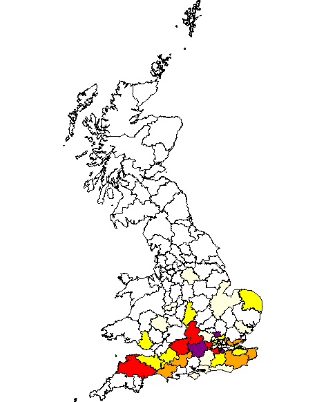 _______________________________________________________________ There was a sustained increase in the number of Brinds up to the 1980s (more births than deaths). The number of births went up by about ten a decade until about the First World War. After that the tide slowly turned. Births decreased and the number of deaths caught up. But, rather surprisingly, there are still far more Brinds being born than dying, in England and Wales anyway! However, registration in the first half of the 19th century was not as certain a business as it is today. It has been estimated that one in ten births were not registered in those early Victorian years. If true that would mean 32 would have to be added to the 325 births between 1840 and 1869 to bring the total to 357! Some confirmation that the Brinds come from Wiltshire (and therefore a small family group) was provided by the 1881 census. In the mid 1990s the Mormons transcribed the entire 1881 census and published it (in alphabetical form) on a county by county basis. It therefore became possible to collect a more or less complete list of the names of Brinds living in the UK in 1881. There were 446 of whom the oldest was 90-year-old Margaret Brind of Winchester. Their average age was just a shade over 25. Looking at the 47 males aged 40 or over, 44.7% said they were born in Wiltshire, 19.1% in Berkshire, 8.51% in each of Middlesex and Kent. The remainder were born in six different counties. Evidence also emerged about one group about whom so far no information has been gathered at all, the Welsh Brinds. The oldest of a group of Brinds living in Monmouthshire in 1881 was John Brind, a 74-year-old retired farmer who was born in Wanborough, Wiltshire. In Middlesex and Kent the picture is nothing like as clear but the oldest male Brind in Middlesex was born in Berkshire. University College London (UCL) researched the the distribution of surnames in Great Britain, at two dates 1881 and 1998, using the census of 1881 and modern marketing data. See http://www.spatial-literacy.org/UCLnames/