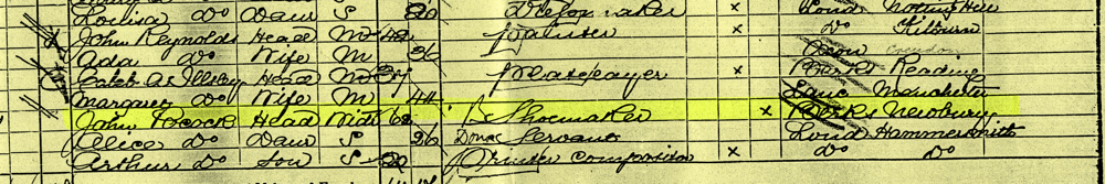The 137 people who lived in the road included 62 children aged 16 or under. None of the children over the age of 13 appears to have been in full time education. Amongst the 14-16 year olds there were two newsboys, a laundress and a dressmaker, a labourer in a soap factory, a bookseller's assistant and Charles (Teddy) Brind, who was an apprentice compositor. The most common female occupation was laundry work. The most common male occupation was the building trade, notably painting. John Brind was a stone mason, and therefore a skilled building worker. Amongst the oldest inhabitants, the 13 who were aged 50 or over, only three were born in London and two in Middlesex. The others were born in Berkshire, Devon, Hampshire, Hertfordshire, Somerset, Suffolk, Surrey and Sussex. Evidently the population of Hammersmith had been growing fast as a result of immigration from the rural shires, as well as some movement outward from the city itself. The two oldest residents of the road were widows, a 76- year-old born in Hertfordshire, and a 77-year-old, born in Middlesex, who said she was supported by friends, when asked how she earned her income by the census collector. |