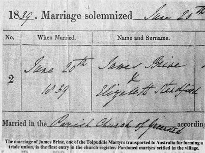 sure forced their Royal pardon, they moved to Greensted. The marriage register, which dates from that time, begins with a record of the wedding of one "martyr", James Brine, to Elizabeth Standfield in 1839. This summer, Greensted children celebrated the 150th wedding anniversary of the couple in St Andrew's by holding mock marriages with the boys dressed as farm hands and the girls as brides. A great great grand-daughter of the "martyr" couple visited the church.