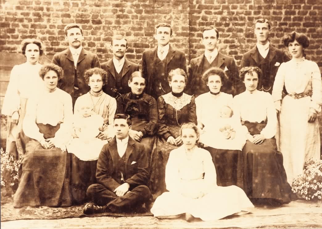 | Top row: Unknown 1, George Louis Fasquelle, Unknown 2, William George (b. 1886), unknown 3, unknown 4, unknown 5. Seated: Lizzie (b.1874), Nellie (b.1877), Sarah (b.1847), Eliza (b 1879)/Edith?, Hetty (b. 1882), Emma Louisa (b. 1884) Seated on ground: unknown 6 & Edith (b. 1889) The baby on Hetty's lap is probably Laurie |